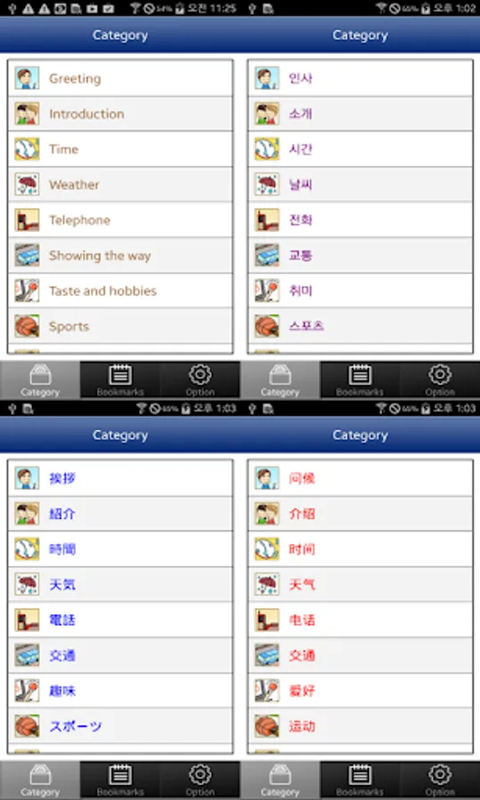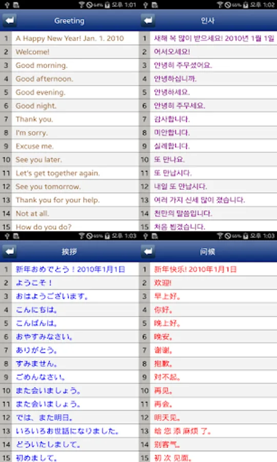1. 일상생활 필수표현 4개국어(영어/한국어/중국어/일본어) 100% 원어민 발음 지원
