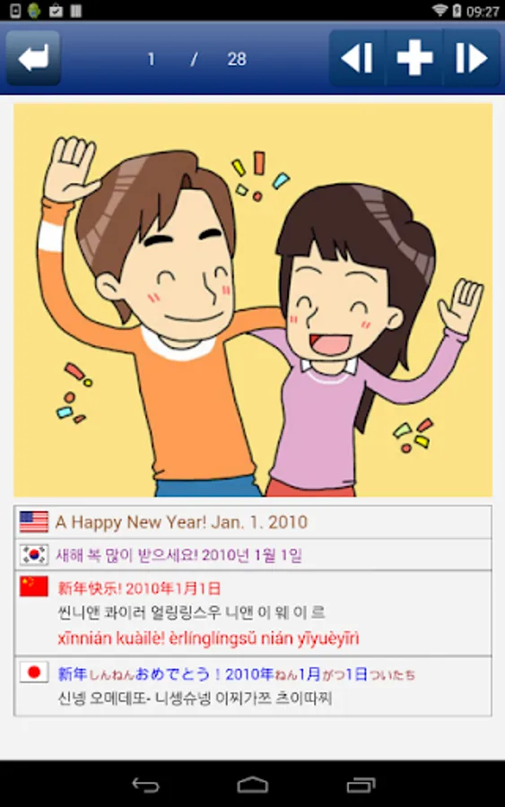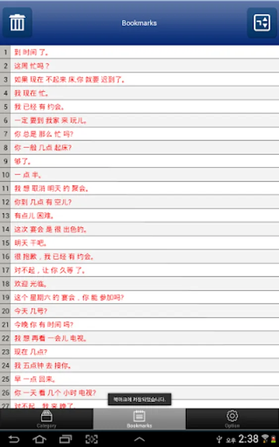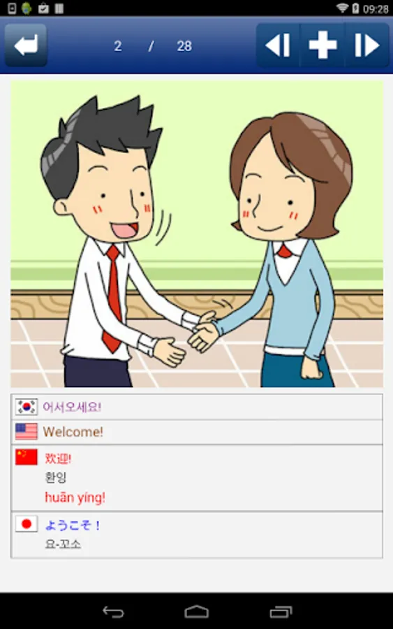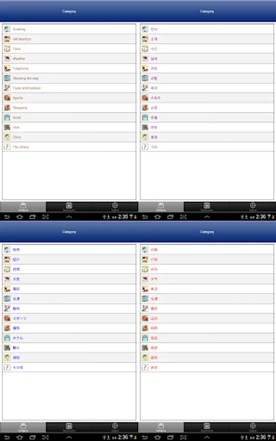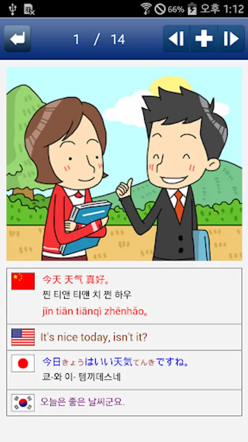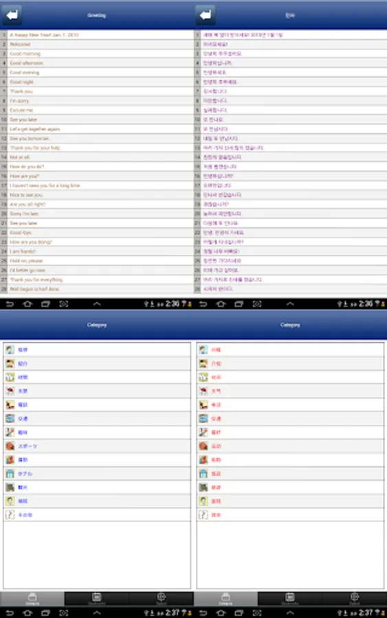 - 일상생활에서 자주 쓰이는 기초 필수 표현을 4개국(영어, 중국어, 일본어, 한국어) 원어민 발음과 함께 학습할 수 있습니다.