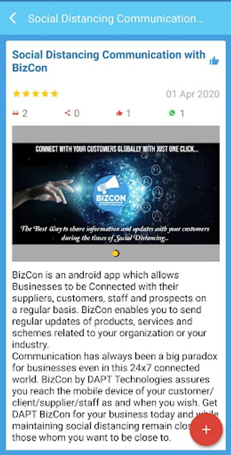 BizCon is an android app which allows Businesses to be Connected with their suppliers, customers, staff and prospects on a regular basis. BizCon enables you to send regular updates of products, services and schemes related to your organization or your industry.