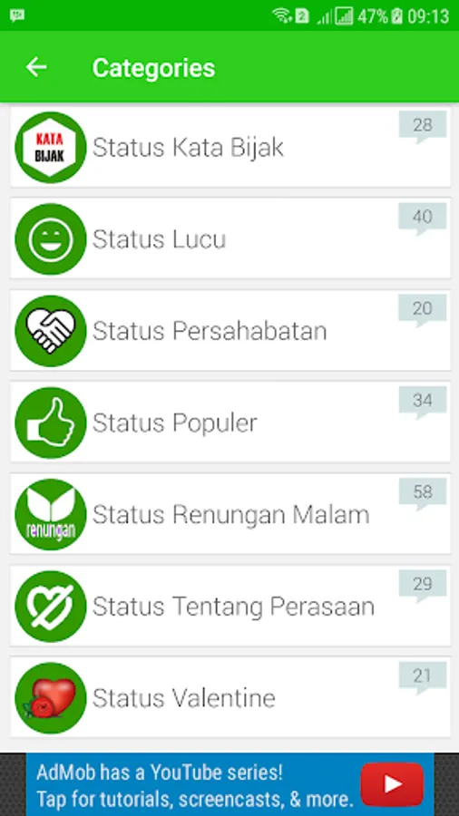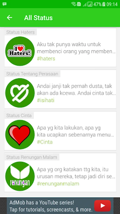 This application contains a collection of words for WA status Cool that you can use to update the status whatsapp with contemporary words, funny and romantic. In this application are available hundreds of cool wa status, variegated funny words, romantic, sad and also motivation. Additionally, WA Status Application very light, simple, free download, can be opened without an internet connection and can copy and paste to share to other social media such as facebook, twitter, instagram, fuel, wattsapp, line and others with your friends.