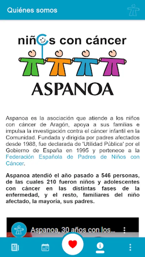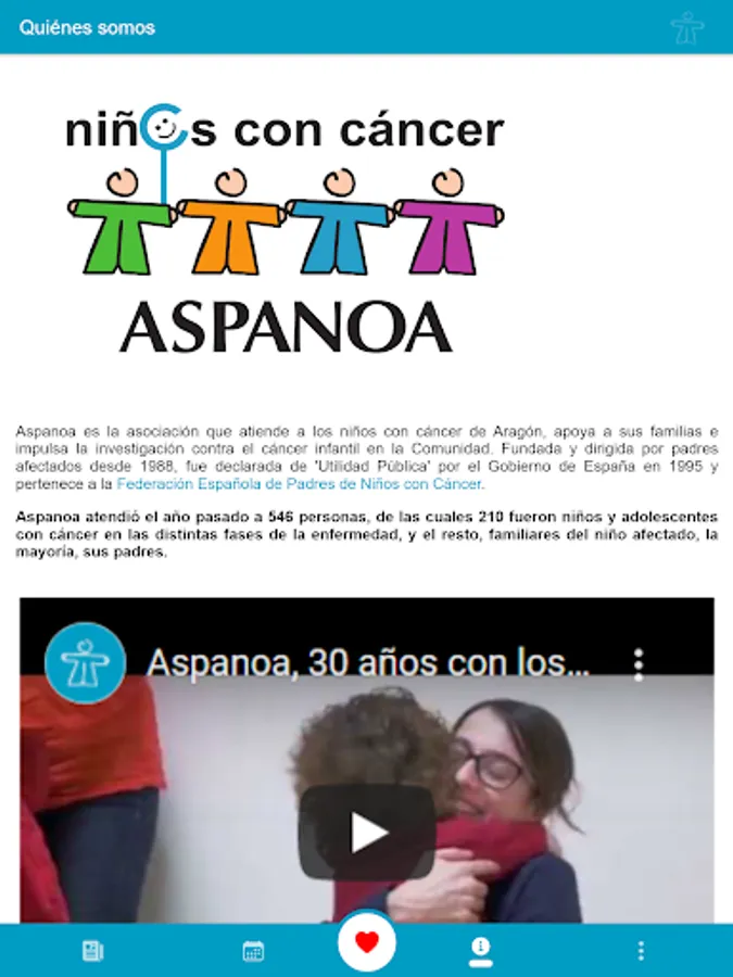 Aspanoa is the association that cares for children with cancer in Aragon, supports their families and promotes research against childhood cancer in the Community. Founded and directed by affected parents since 1988, it was declared a 'Public Utility' entity by the Government of Spain in 1995 and belongs to the Spanish Federation of Parents of Children with Cancer.