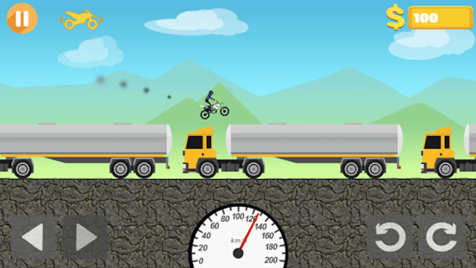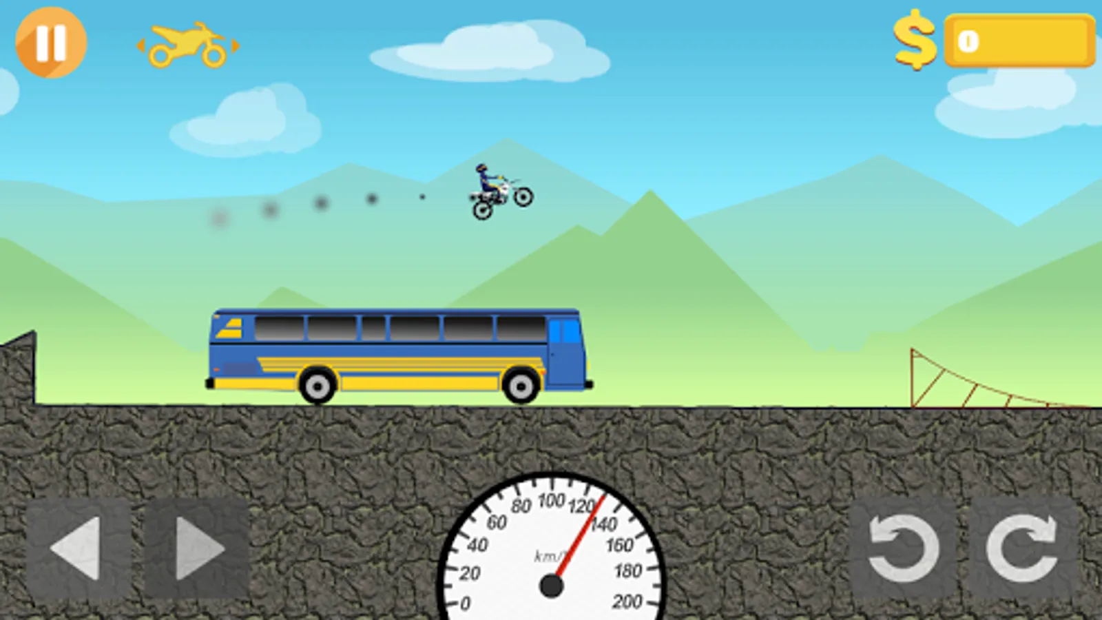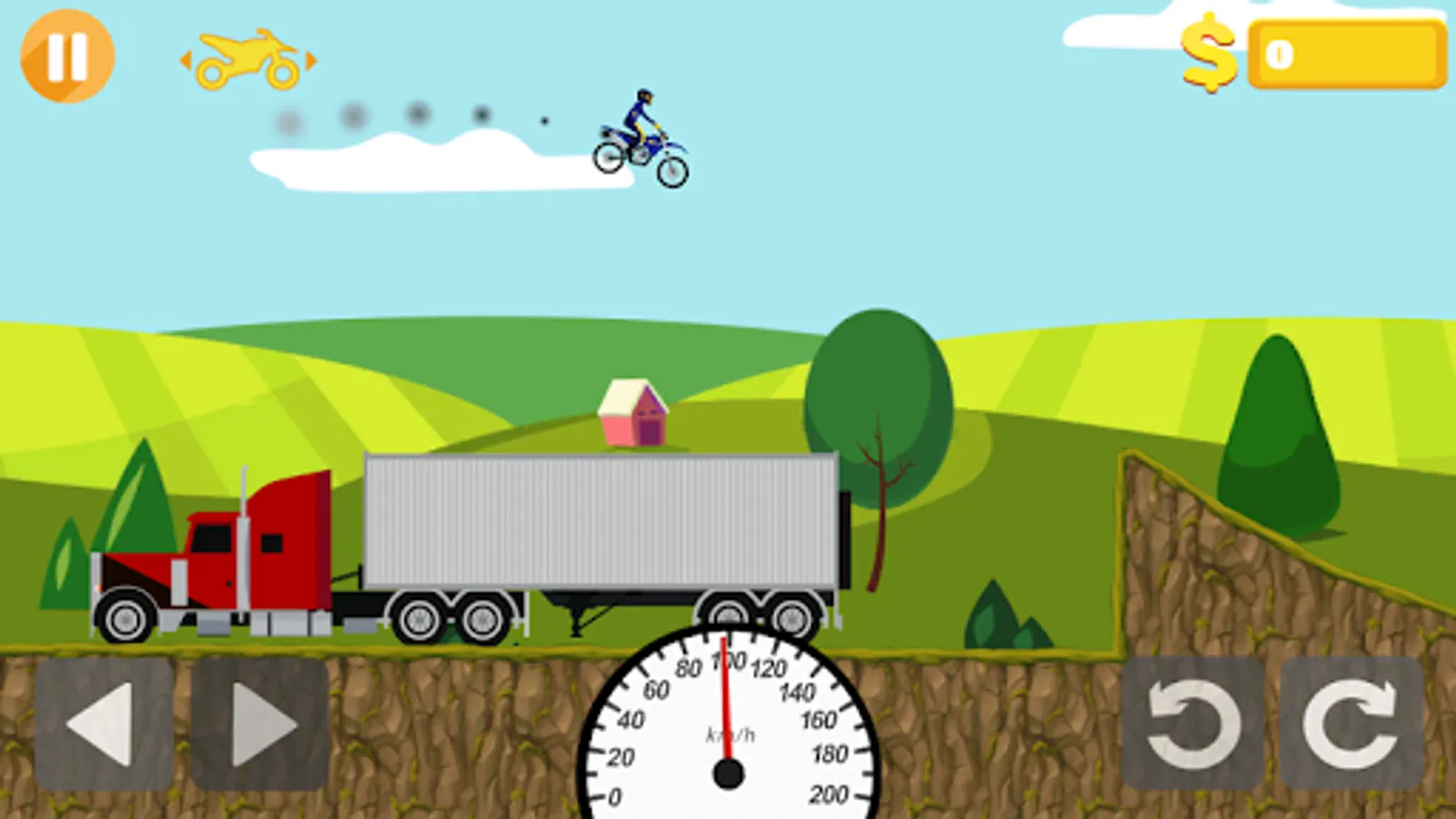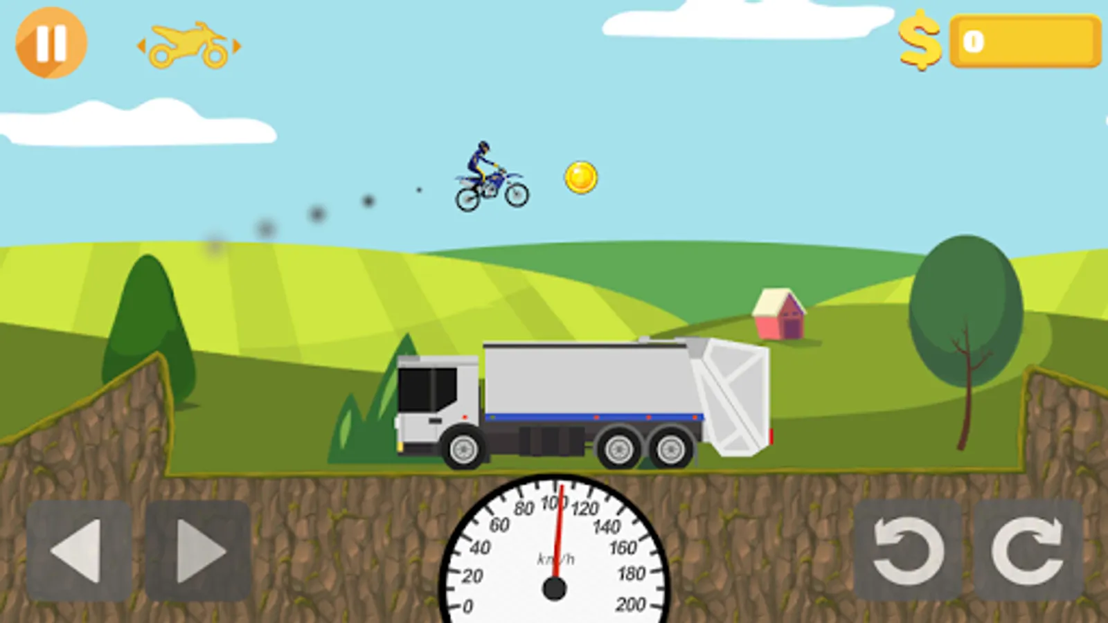 Ride motorcycles on the hills and jump over cars, trucks and other obstacles, avoiding crashing. Perform stunt: wheelies, backflips and frontflips to get bonus points. Unlock faster motorcycles to finish all levels.