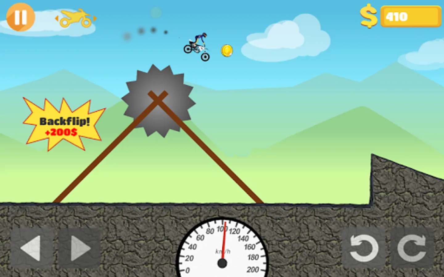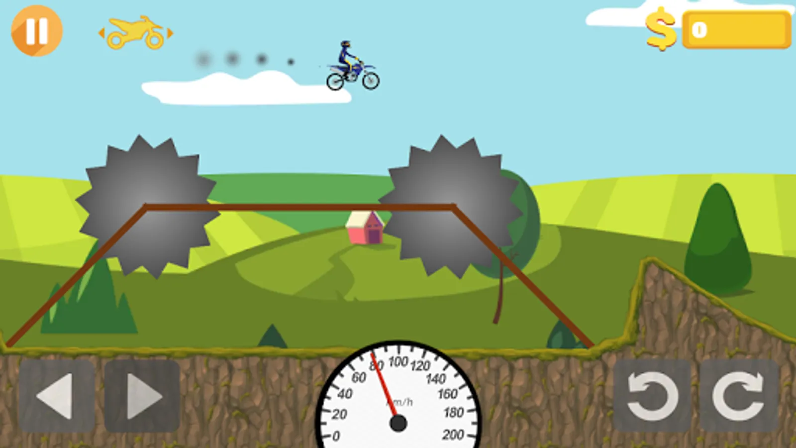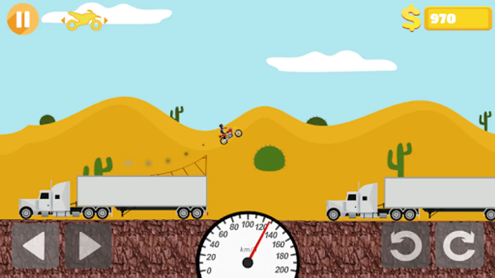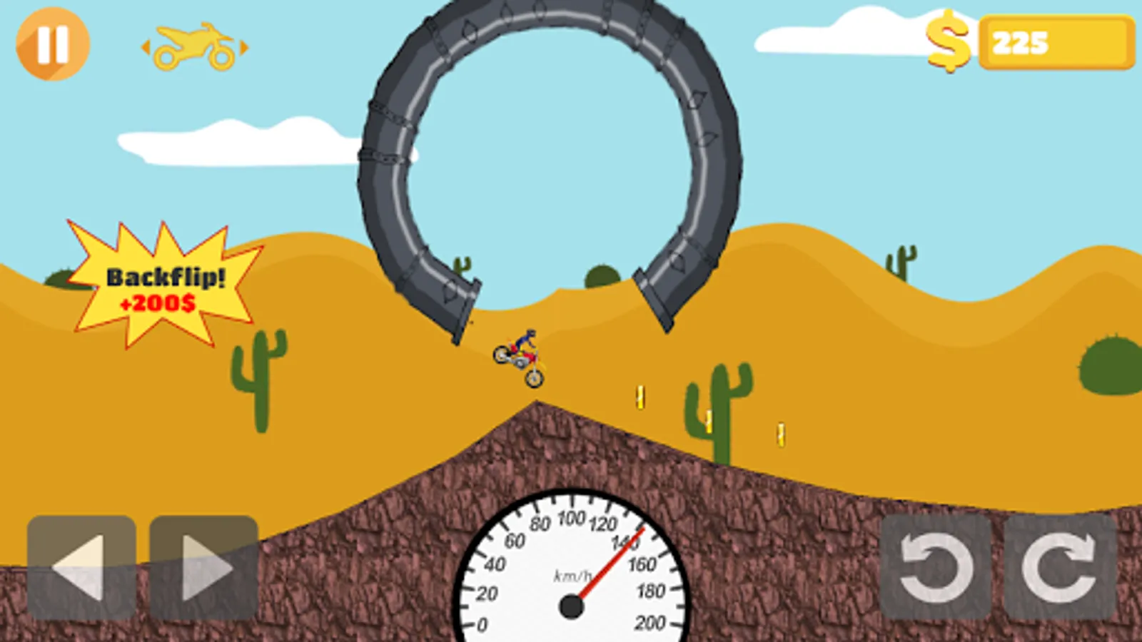 Ride motorcycles on the hills and jump over cars, trucks and other obstacles, avoiding crashing. Perform stunt: wheelies, backflips and frontflips to get bonus points. Unlock faster motorcycles to finish all levels.