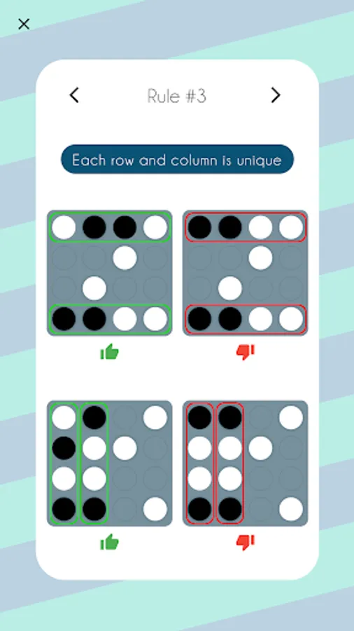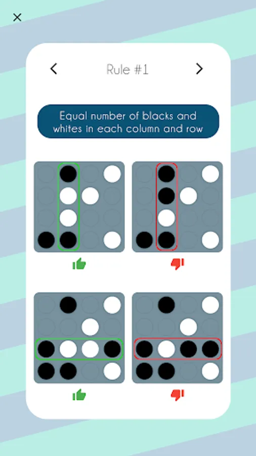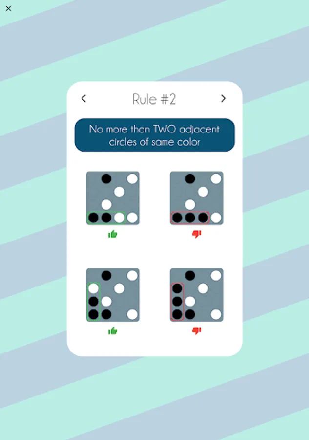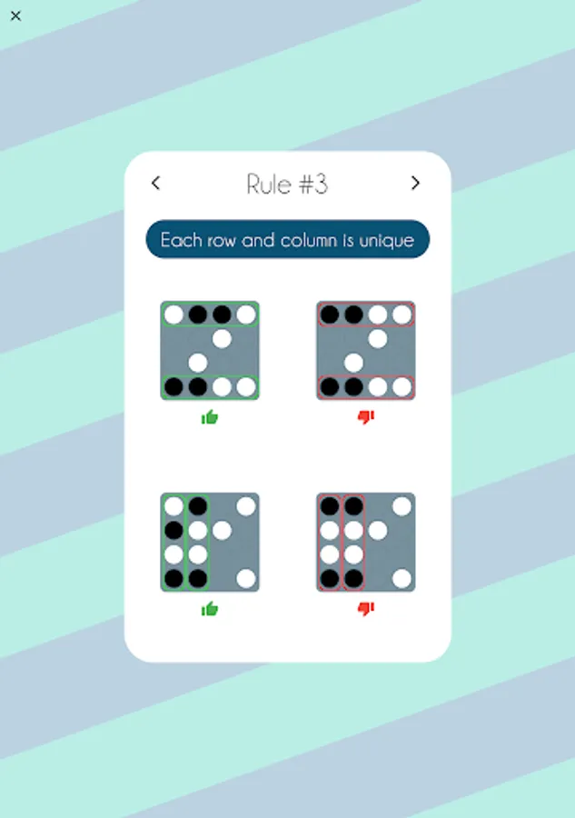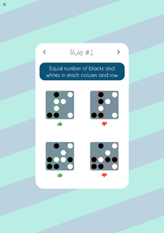 Also known as Binero, Takuzu, or Binairo, the game is played on a grid consisting of empty cells and cells filled with white and black circles. The goal is to fill each empty cell with either a black or white circle by respecting the following 3 rules: