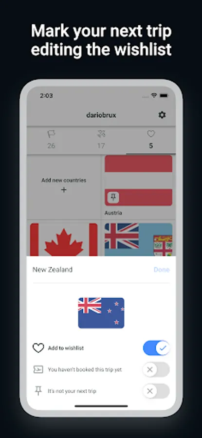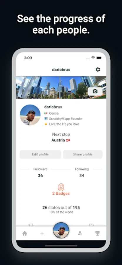 Scratch all places you have visited and see what your followers have scratched. Don't worry if your progress is slow, you will have all the time to visit all countries. A day you will scratch all over the world!