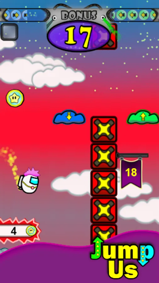 Fly over the towers, collect the coins between jump and jump, use the boosting clouds to jump higher "green arrow" or cancel the jump "blue arrow" every time you jump a tower with the X is a point to your record, reach 100 โญ points and show that you are the most agile crew member.