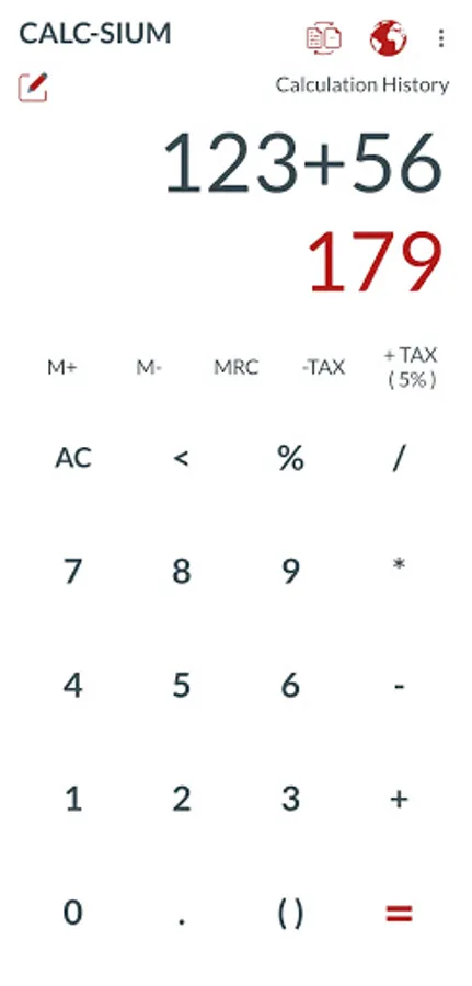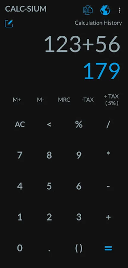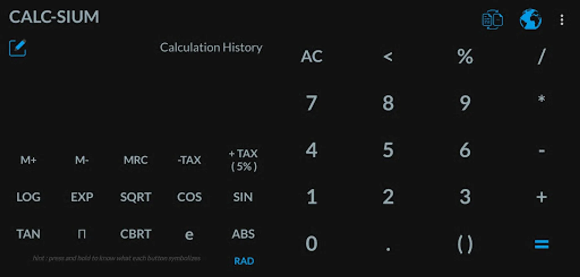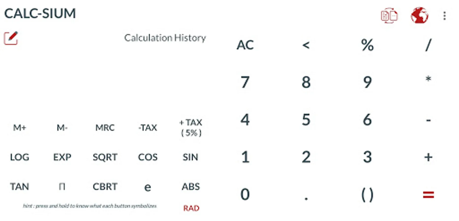 7. Tax : Calc-sium has a powerful feature of adding tax value to your calculation. Once you setup tax feature, it shows a button with the tax value on it, therefore anytime you need to add the tax value to your calculation, just press the tax button and it gives you an output with the tax added as well as shows you how much tax was collected as well. There is an option to disable tax as well.