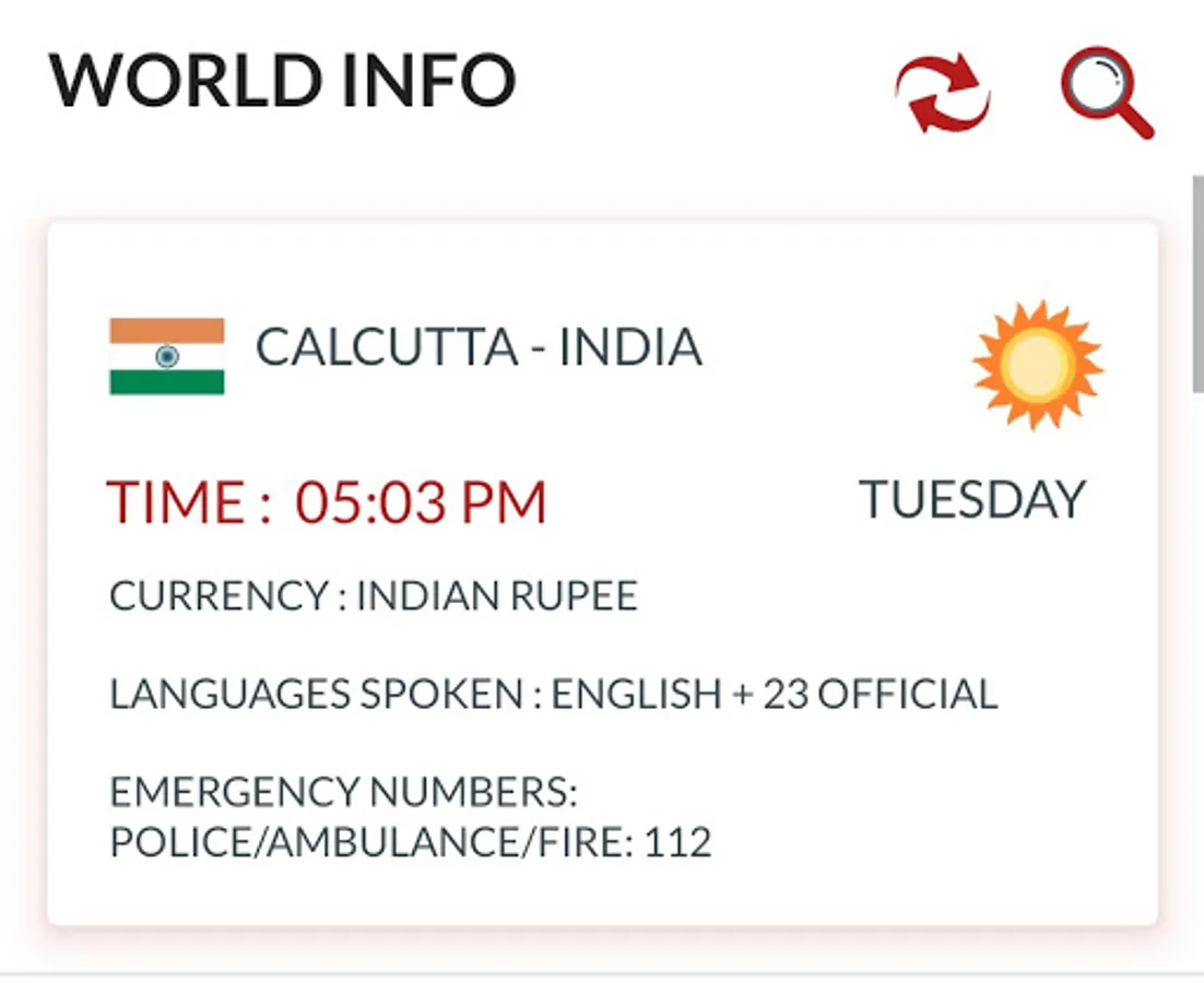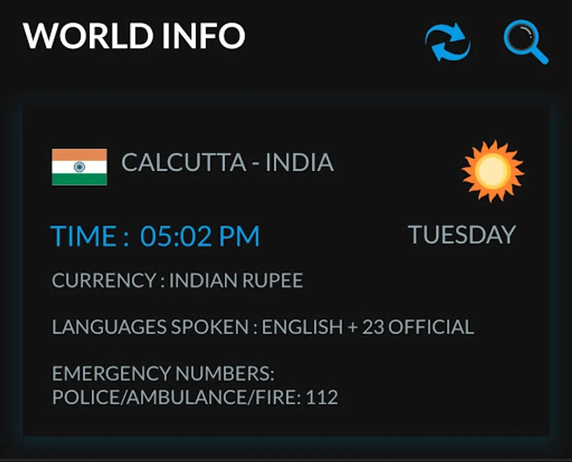 6. World Information: Calc-sium also comes with world time, Currency, Languages Spoken and Emergency Numbers. A sun and moon icon is displayed on the side to identify the day or night time.