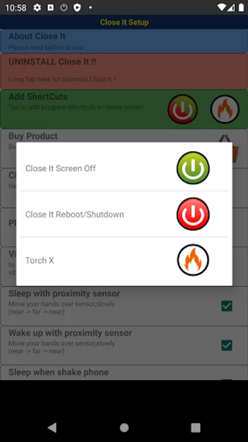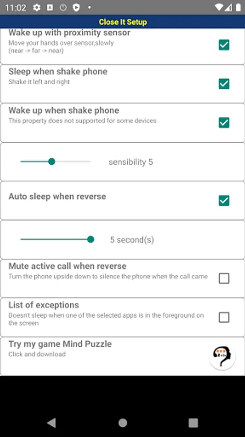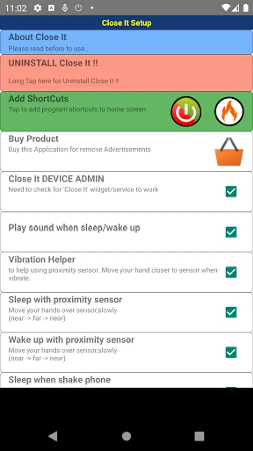 Important : to use sensors, Close It must be run as a service on your phone, if you dont want this (off course 6 properties will not work) you can use just a widget for sleep mode..