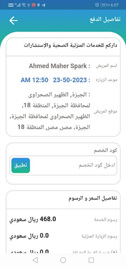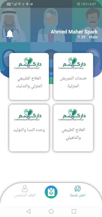 The Darcom application is used to book appointments for visits for patients who wish to obtain home visit services in the Kingdom of Saudi Arabia, where the patient fills in his data through the application and determines his location, and after completing his data entry, he chooses the service he wants to book and chooses the date of the visit