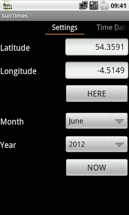 Display times for the selected month, with Sunrise, Sunset, length of day and the current phase of the moon shown.