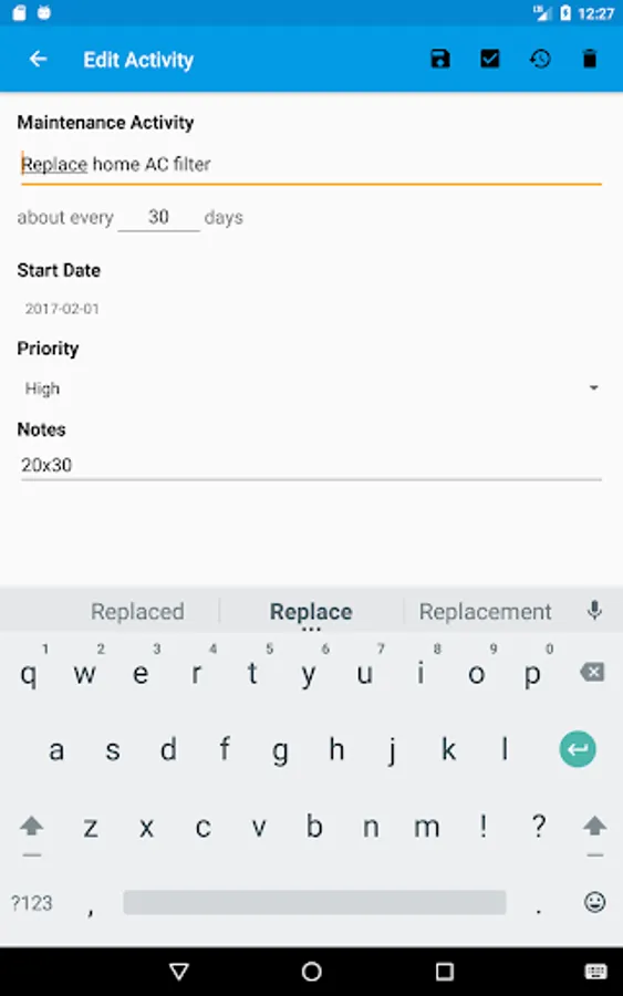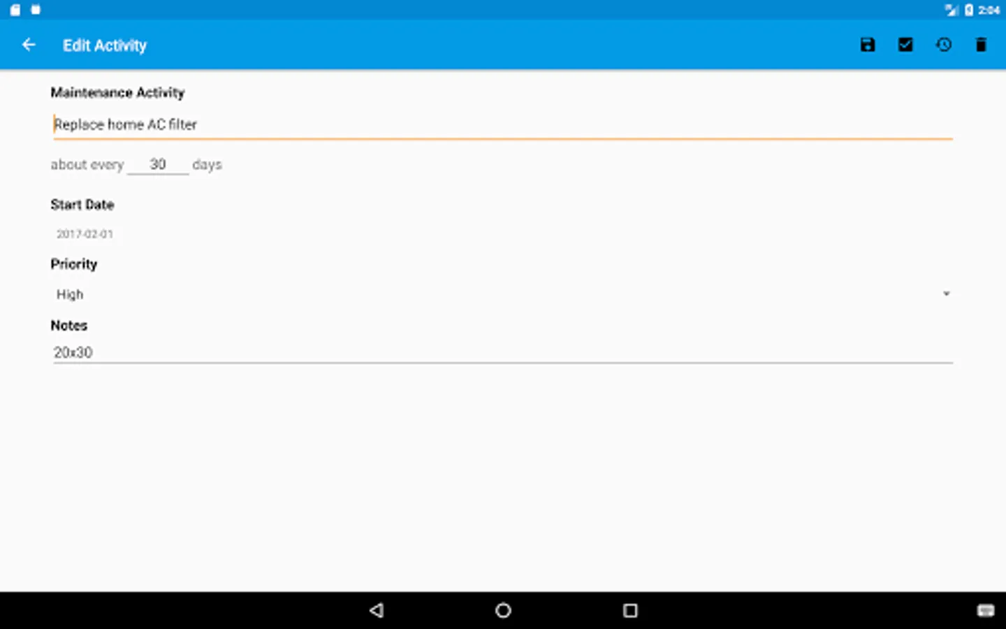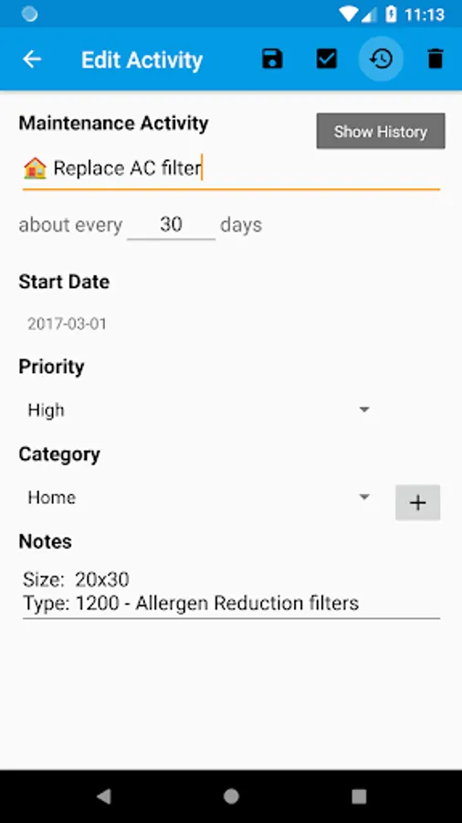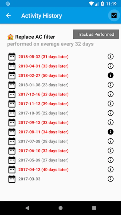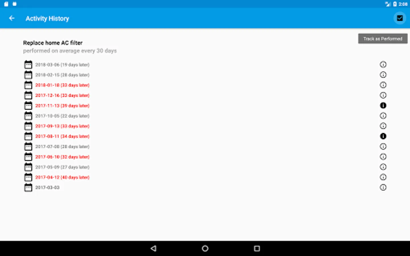 The activity history shows a full list of all the dates on which the task was performed and shows the average number of days between dates performed. Tap on a date performed if you need to edit or delete that history record.