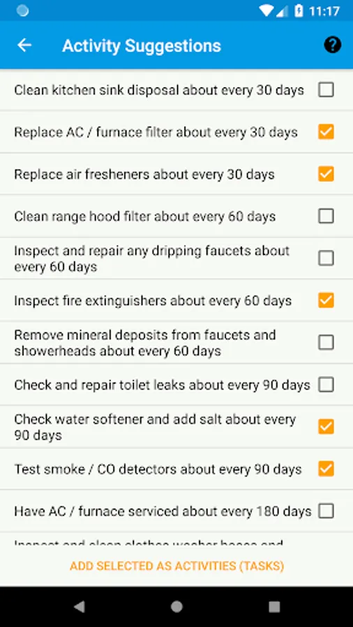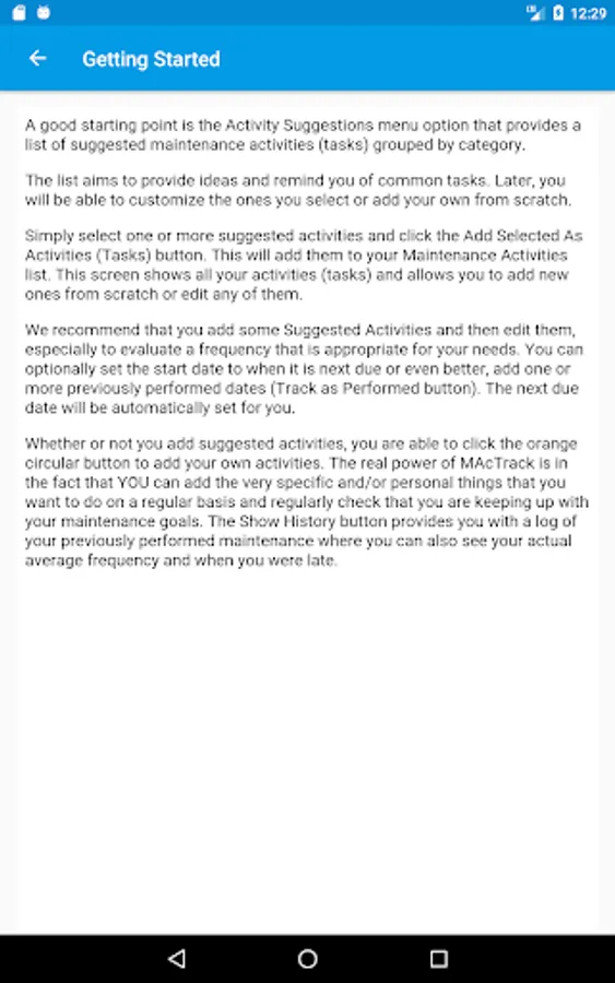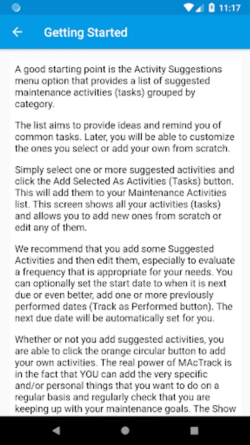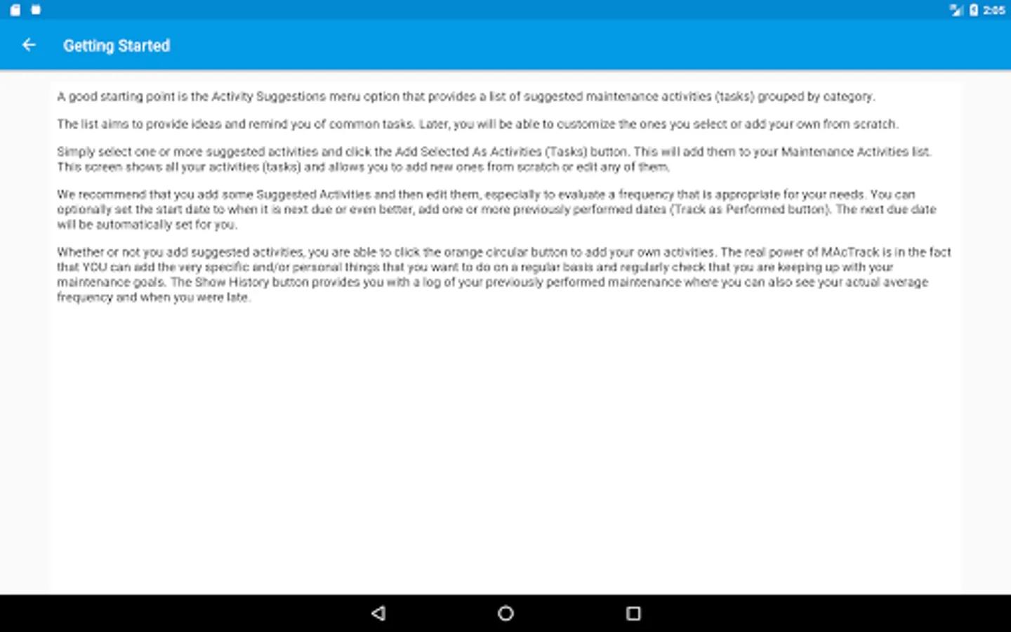 MAcTrack is designed to be extremely simple to add and edit maintenance schedules that recur on some frequency of days. A new task / activity is due on the defined start date and when you track the activity as performed, the new due date is automatically set based on the date performed and frequency.