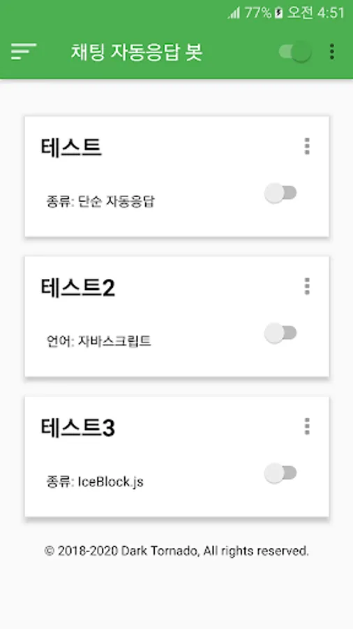 Each bot can be turned on/off separately, and all bots are deactivated by turning off the switch on the top bar.