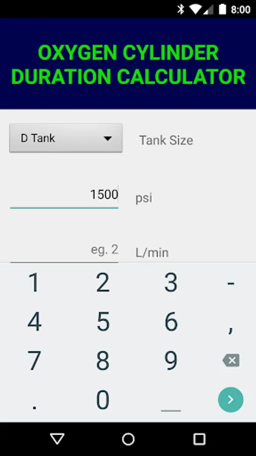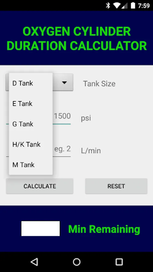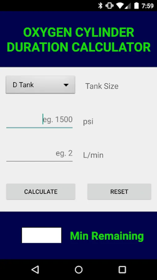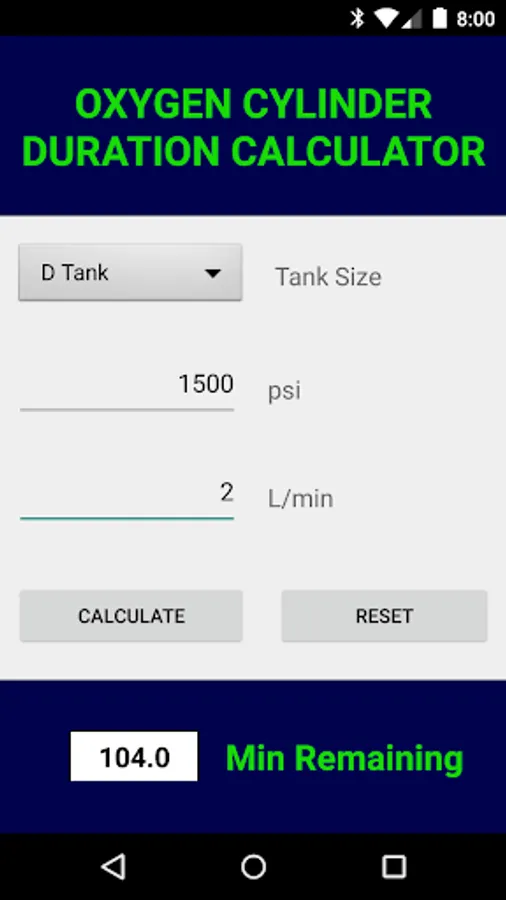 Calculate the number of minutes remaining in an oxygen tank based on tank size, pressure and continuous flow rate.The following equation is used to determine the remaining duration of flow: