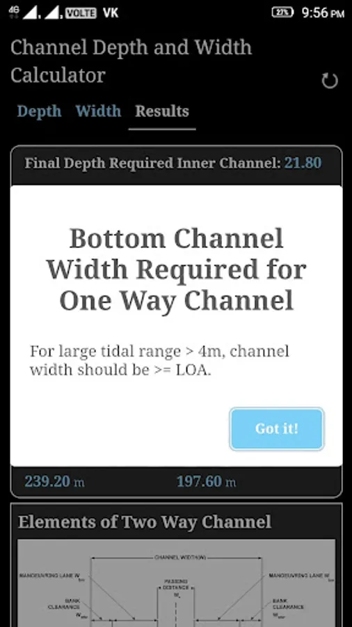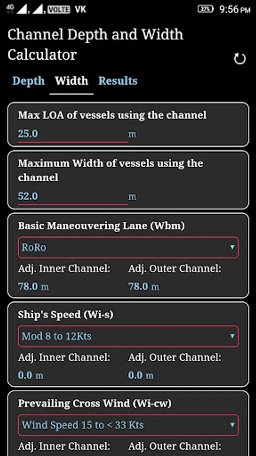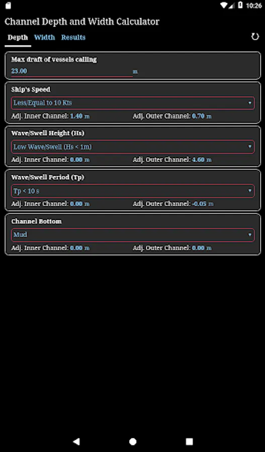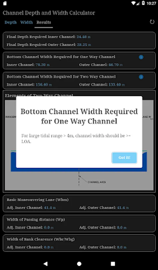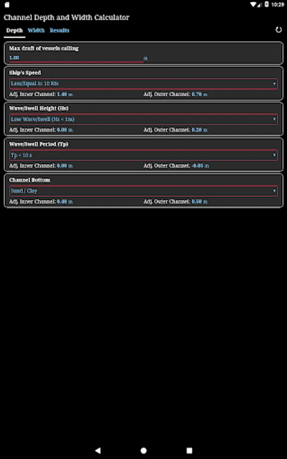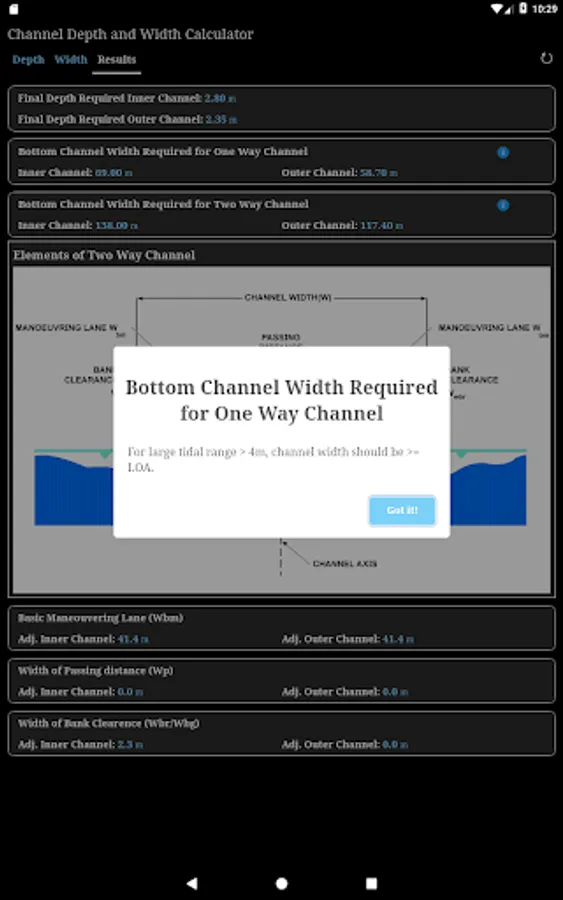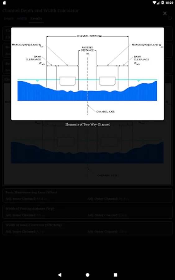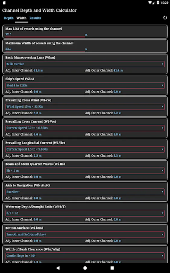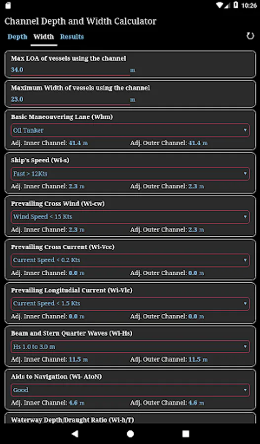 The purpose of this App is to determine the Depth and Width required in an Inner or Outer Channel for a ship based on its Deepest Draft, Length Overall and Beam.