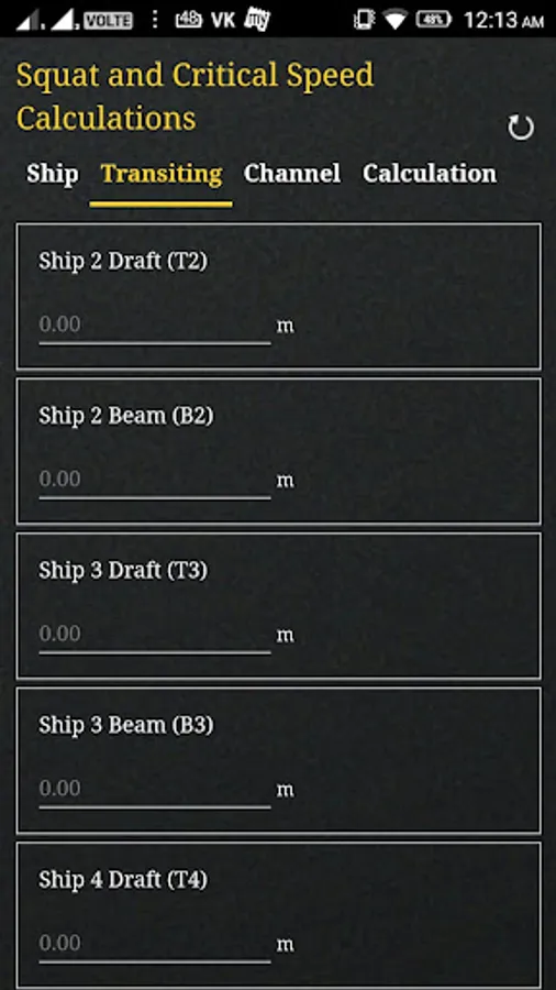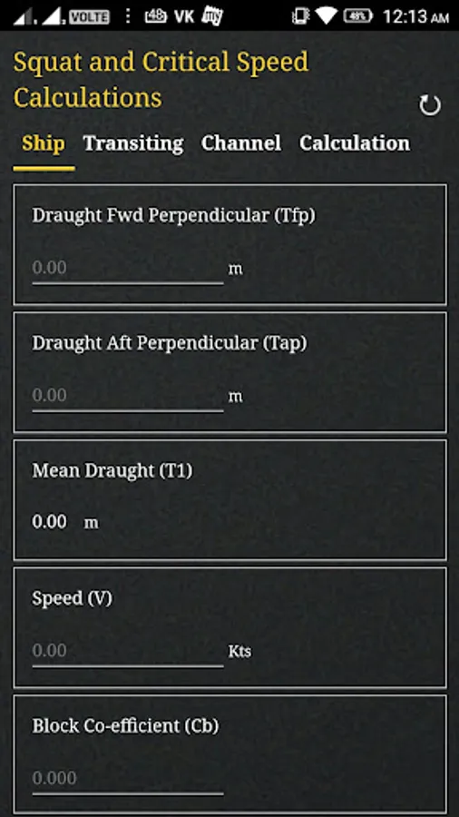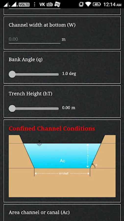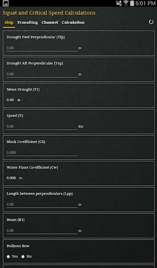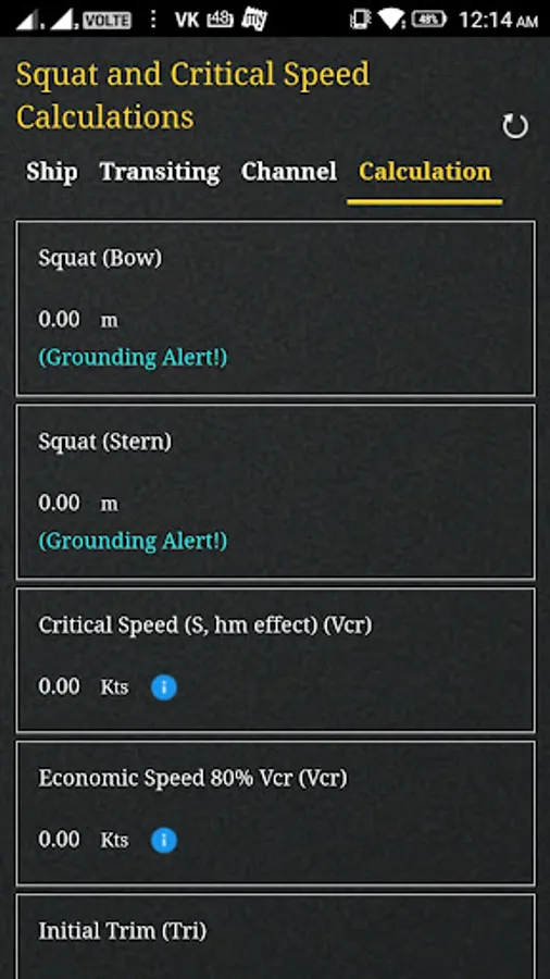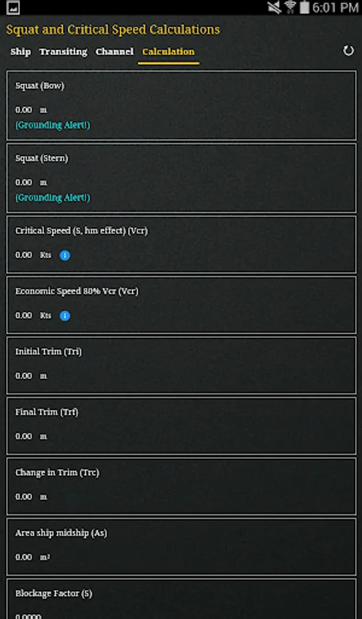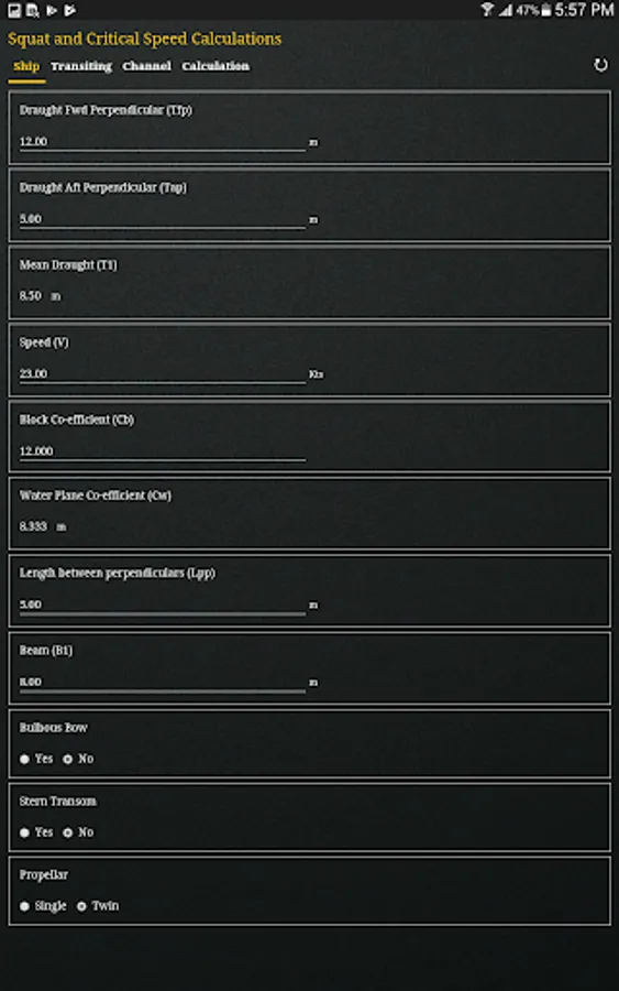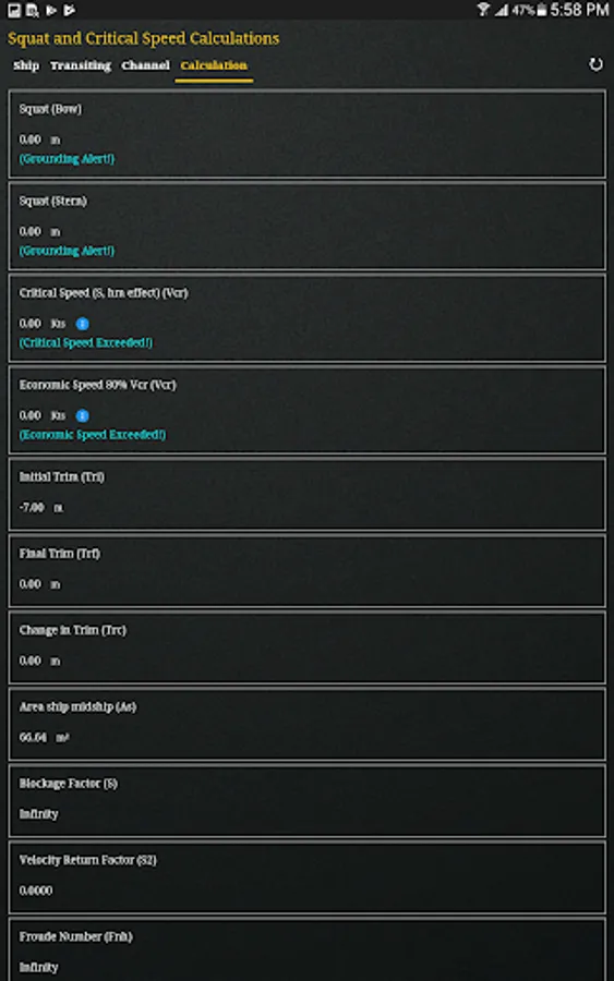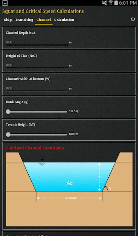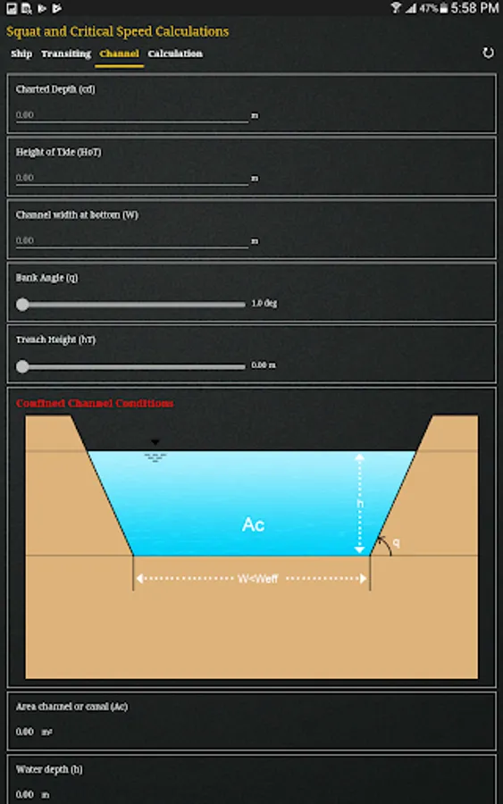 The App determines the channel types (Confined Channel, Restricted Channel, Unrestricted Channel) using Barrass’s equation for ‘Width of Influence’ and comparing it with the bottom width of the channel. It also determines the Critical and Economic speed of the vessel transiting the channel that should not be exceeded.