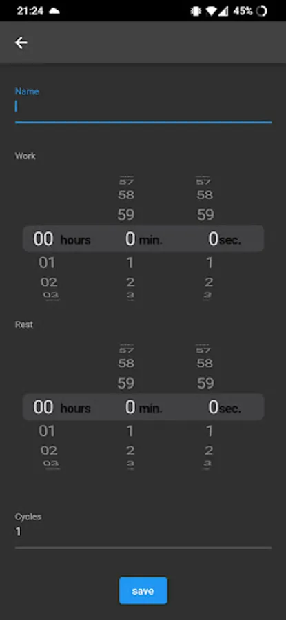 Allows you to set up a work and rest timer with the ability to set number of repetitions. At the end of each timer a beep is played, the beeps are different for work and rest timer.