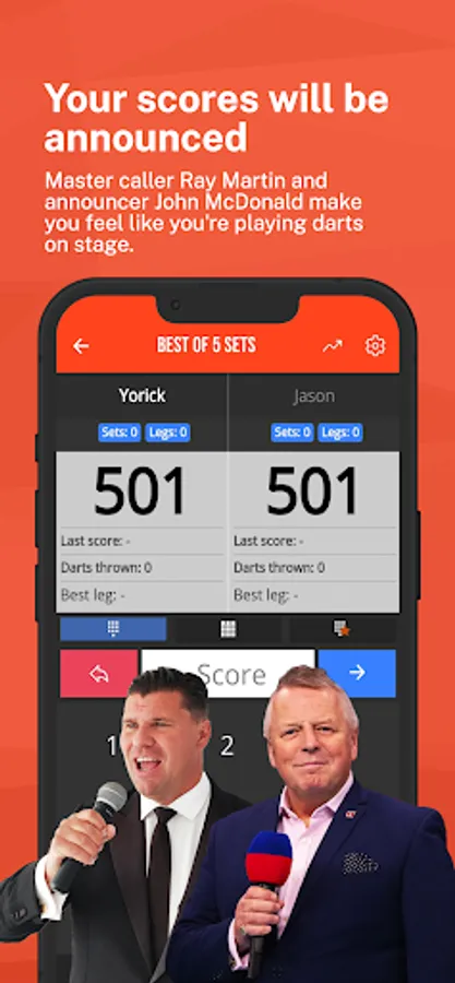 In the x01 games you will hear the voice of MasterCaller Ray Martin who will announce your name and your scores.