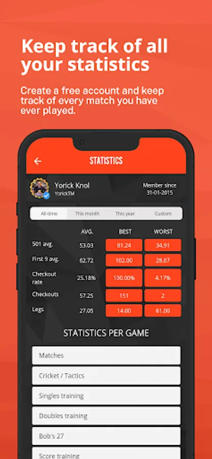 Play with multiple players with a DartCounter account and the whole game will be saved in both accounts.