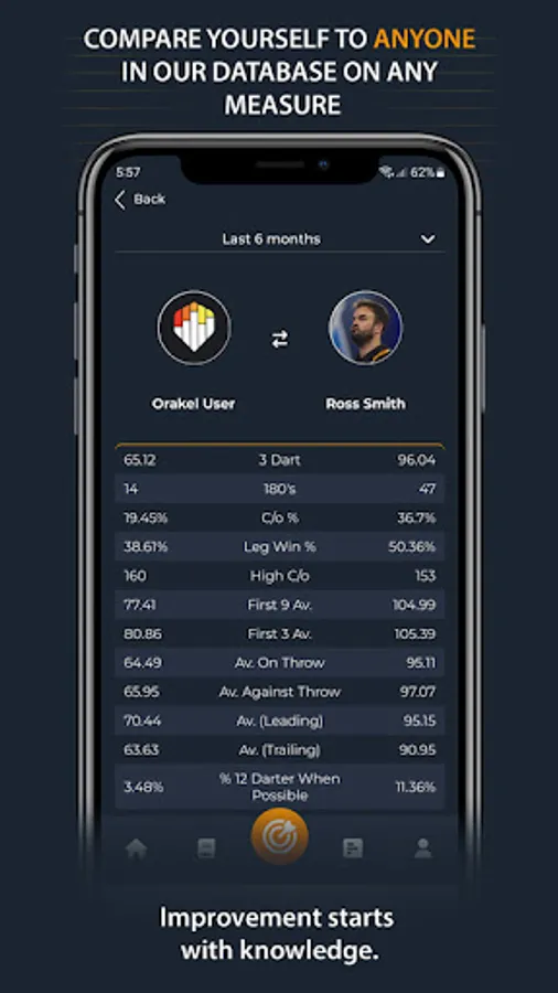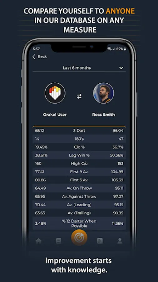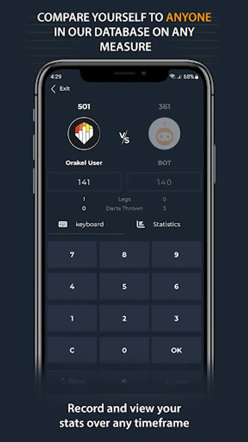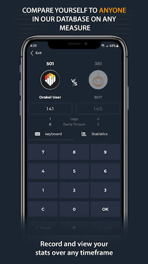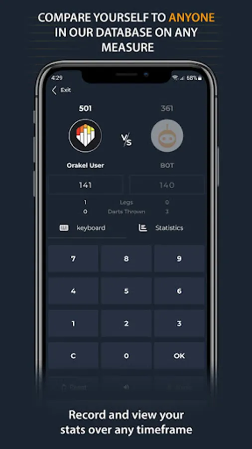 The app enables you to play matches of 501 against your friends, in person or online. All data is stored and connected to the main Darts Orakel database so all types of stats can be viewed and compared against any other player in your network, or players on the official tours like the PDC.