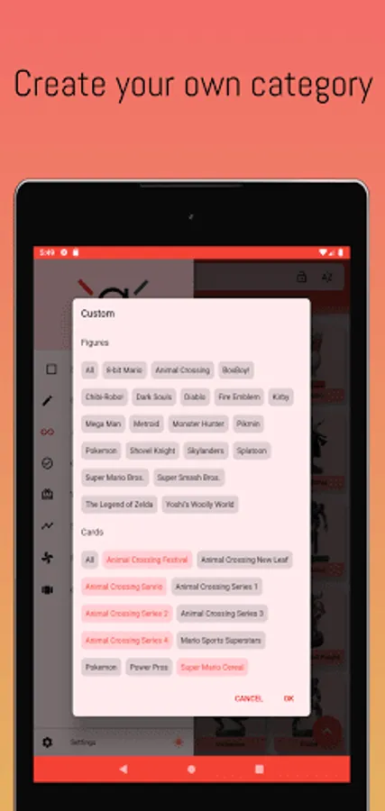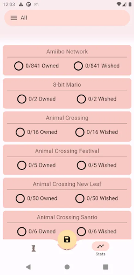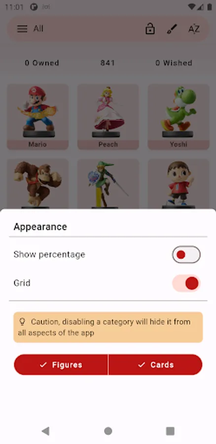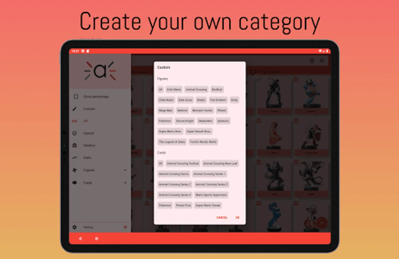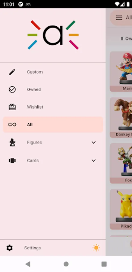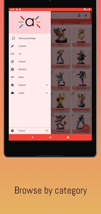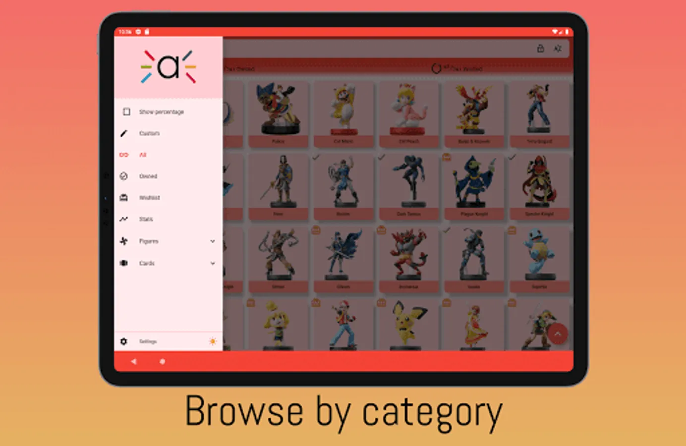 ● Category list drawer to show by All, Custom, Owned, Wished, Stats or by amiibo series split by figures and cards