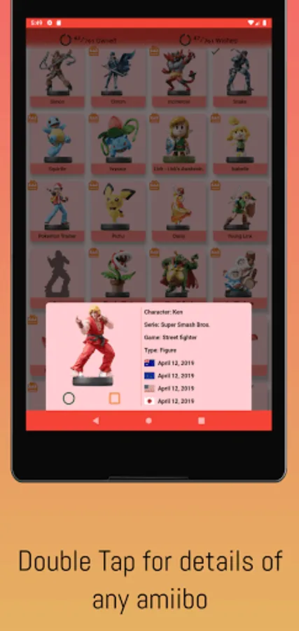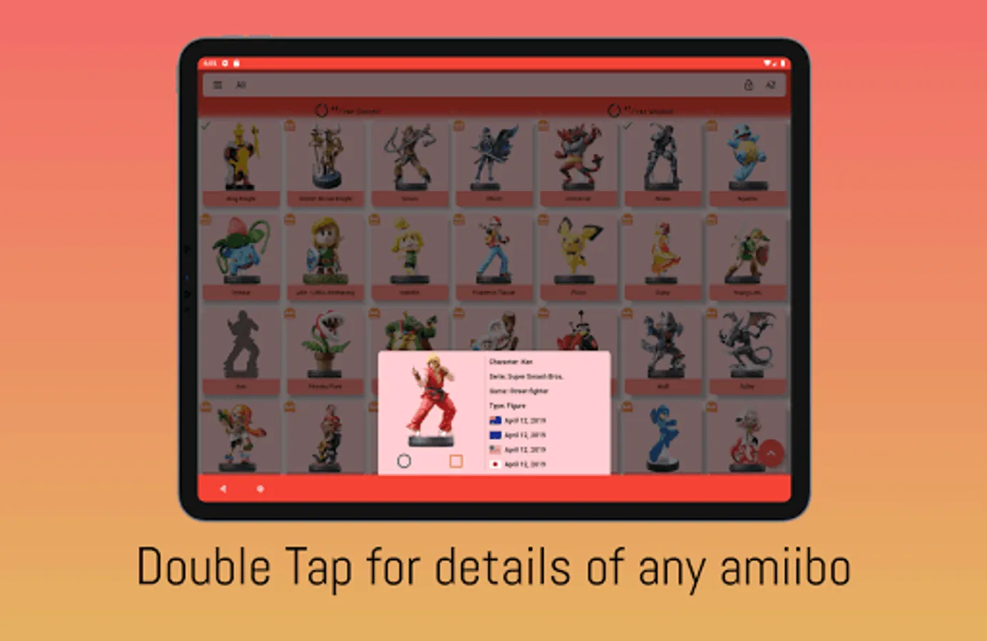 ● Double tap to see the detail of any amiibo, release date, character name, game or add it directly to any list you want from there