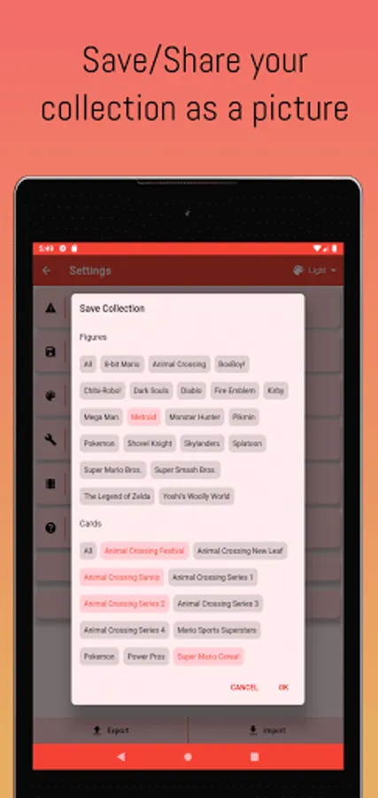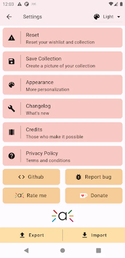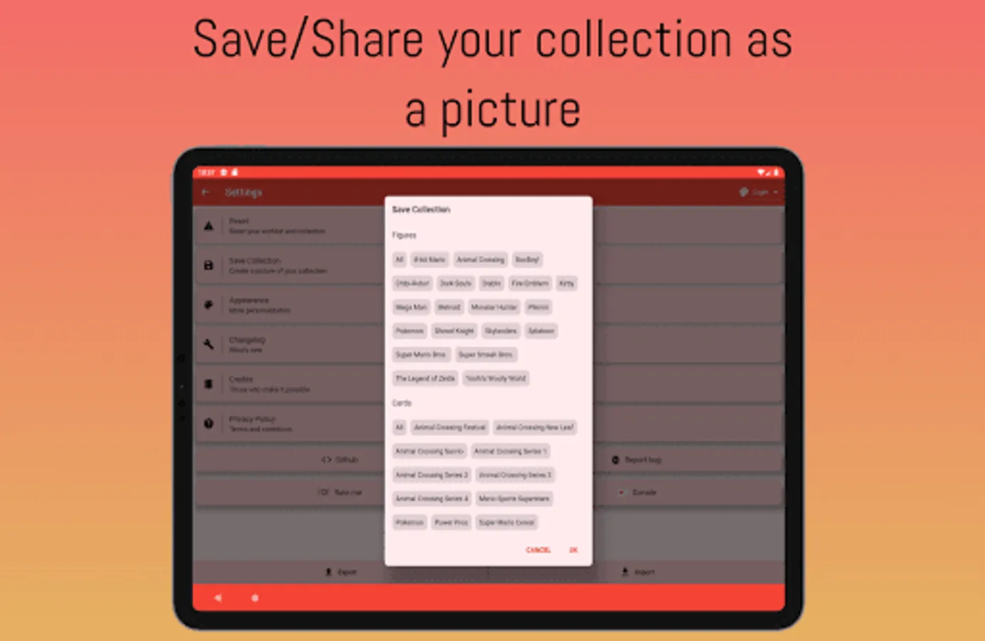 ● Save your collection as a picture, reset your collection or import/export your collection data (useful when changing device) all from settings