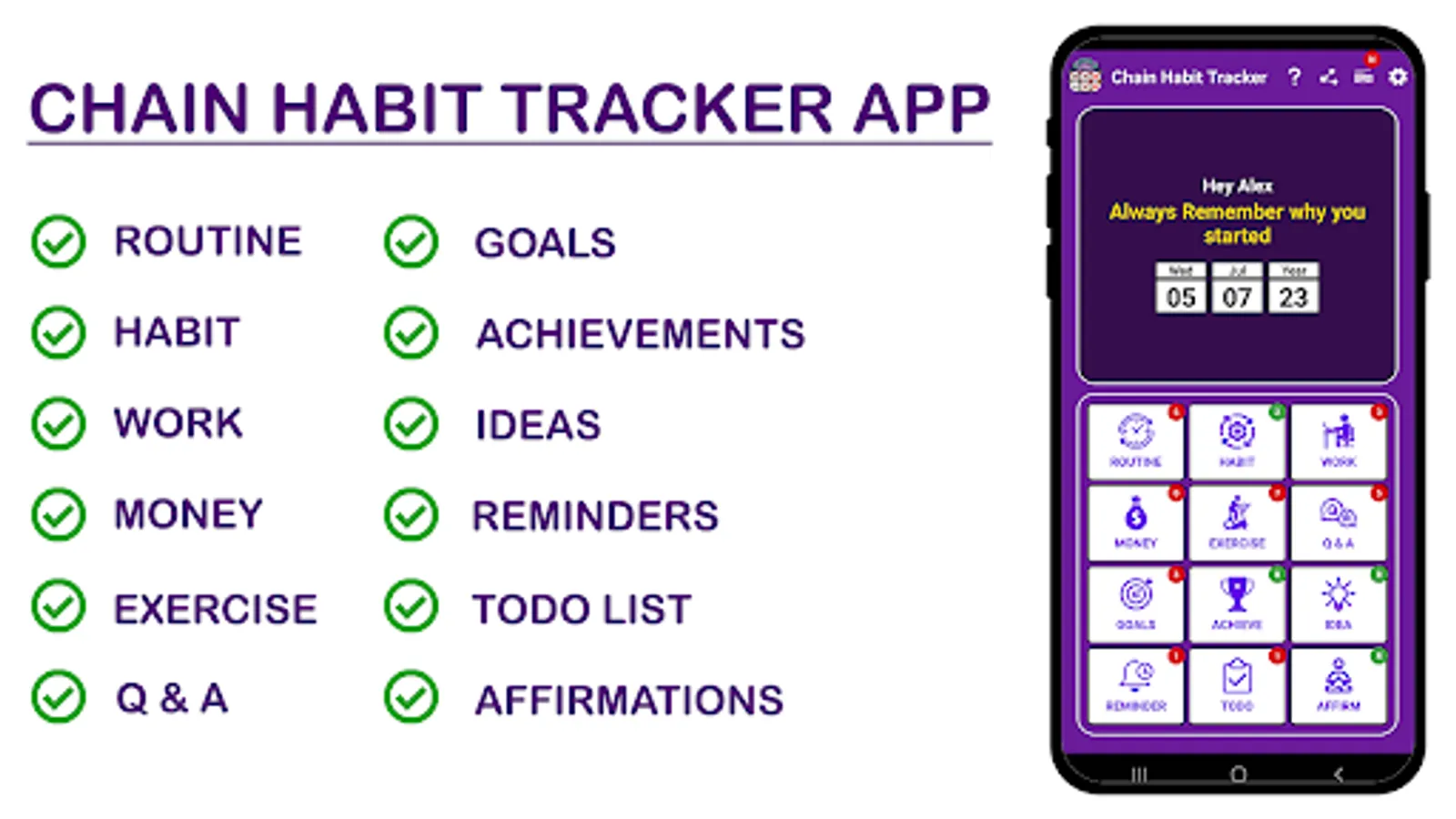 This habit tracker app 2023 offers everything you want to tracker your daily routine, daily habit calendar, your work with projects, money expenses , money savings, daily exercise , daily ask yourself strong question , your life goals, achievements, ideas, todo list, Reminder, Daily Motivation etc. Track your routine make your life accountable!