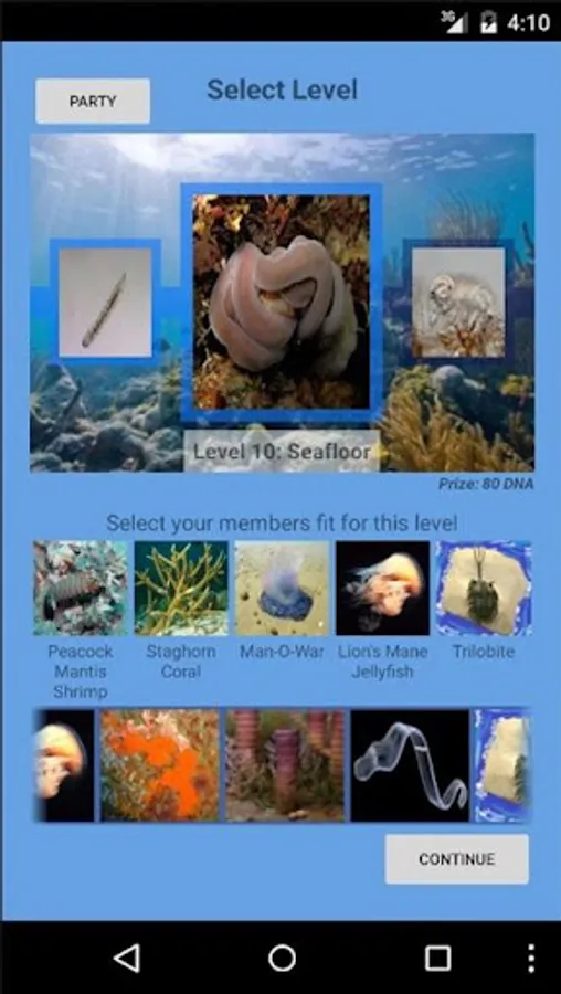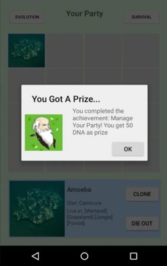 The game has generally 2 parts to play. In the "evo" mode, you can make your animals evolve from one to another. The evolution paths strictly follow informations given in Wikipedia and other serious zoology reference, so you could feel the best about how animals evolve in the real history of earth. The other mode, called "survival", allows you to team your current species your have got and battle with enemies. This part tells the truth that it's hard for animals to survive in the various environment, facing all the other species trying to occupy your territory, leech and even feed on your team member.
