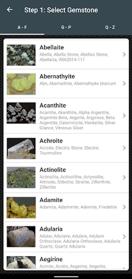 ✪ Browsable A-Z list of crystals, gemstones and minerals, each with its own image and complete geological profile.