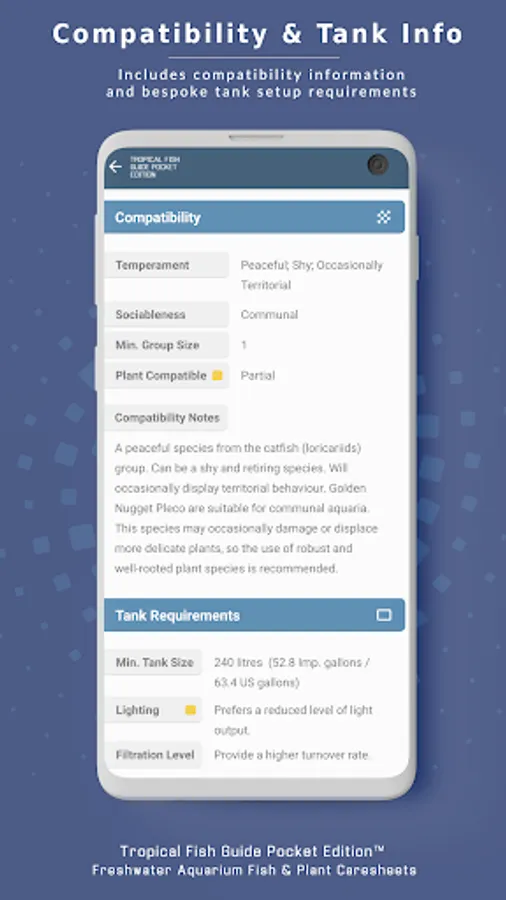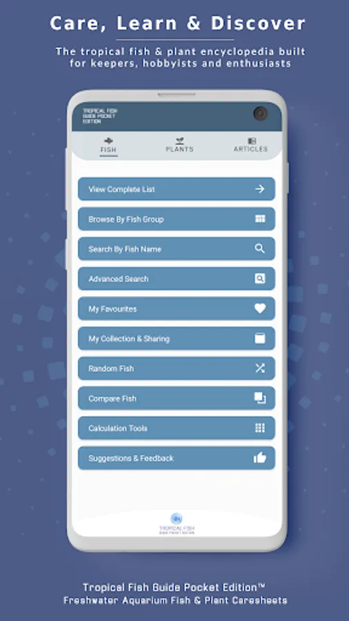 The award-winning premium pocket reference for freshwater tropical fish and aquatic plants. Learn how to correctly care for individual tropical aquarium fish species with our tailored care sheets, facts, biological data and compatibility information for hundreds of freshwater fish and plants. Suitable for all ages and experience levels.