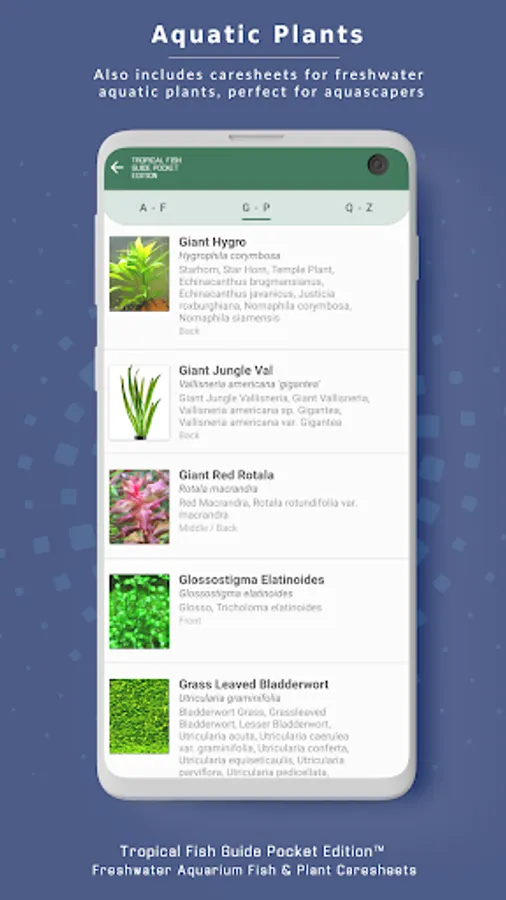 ✪ Huge A-Z list of freshwater aquarium fish and plants, each with its own image and tailored data.