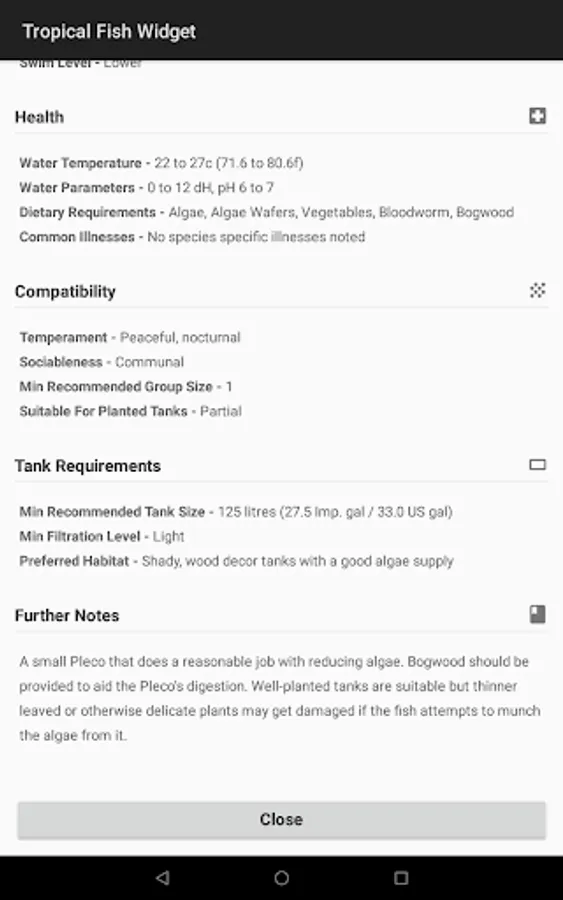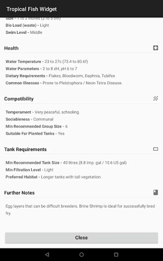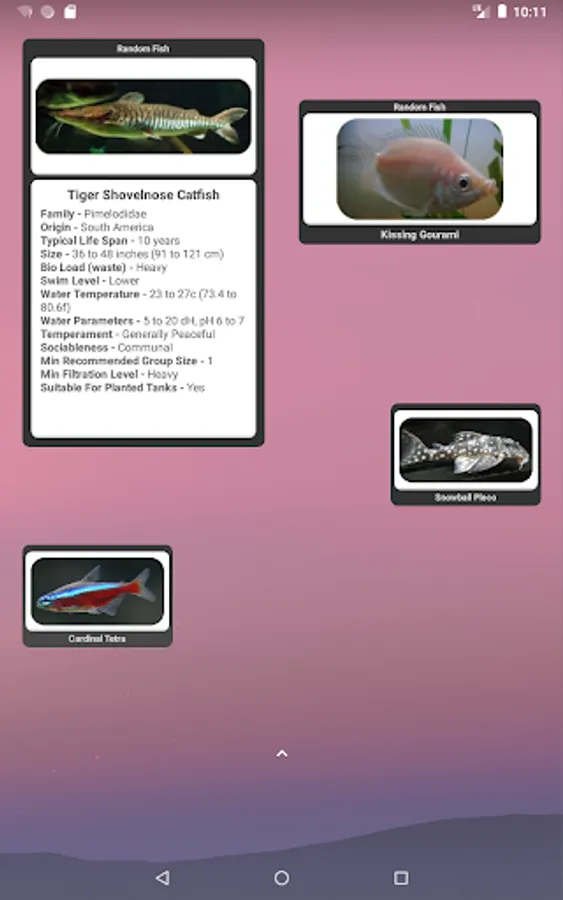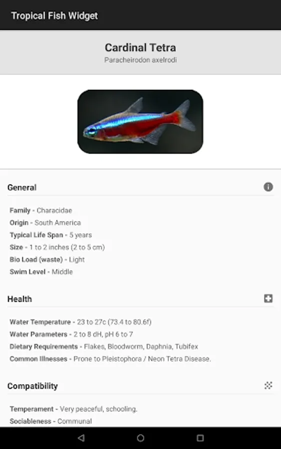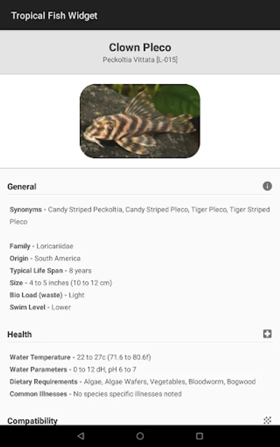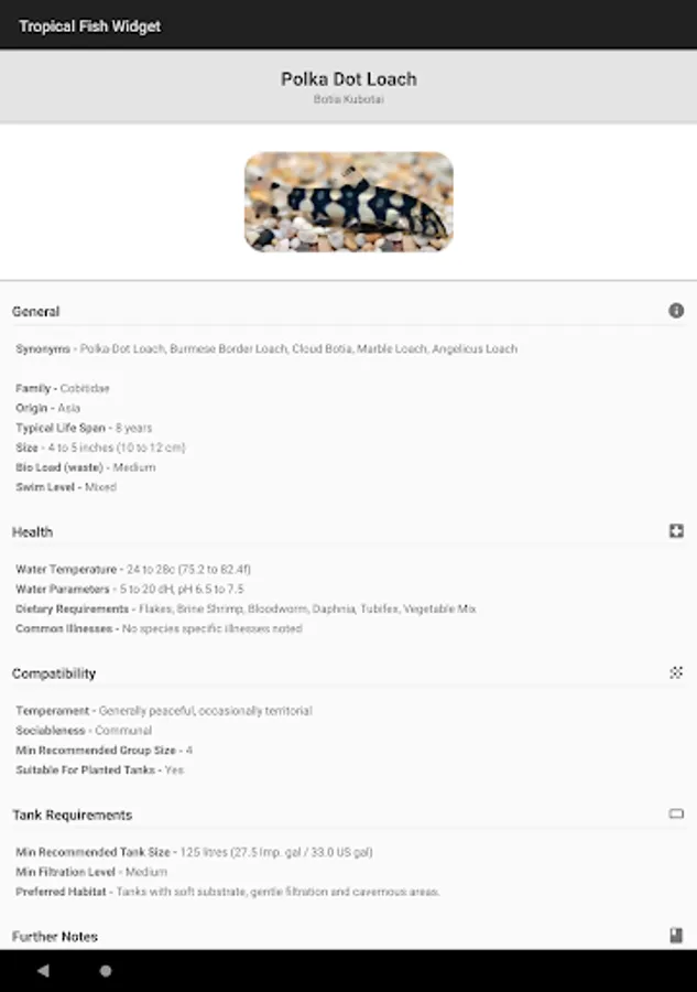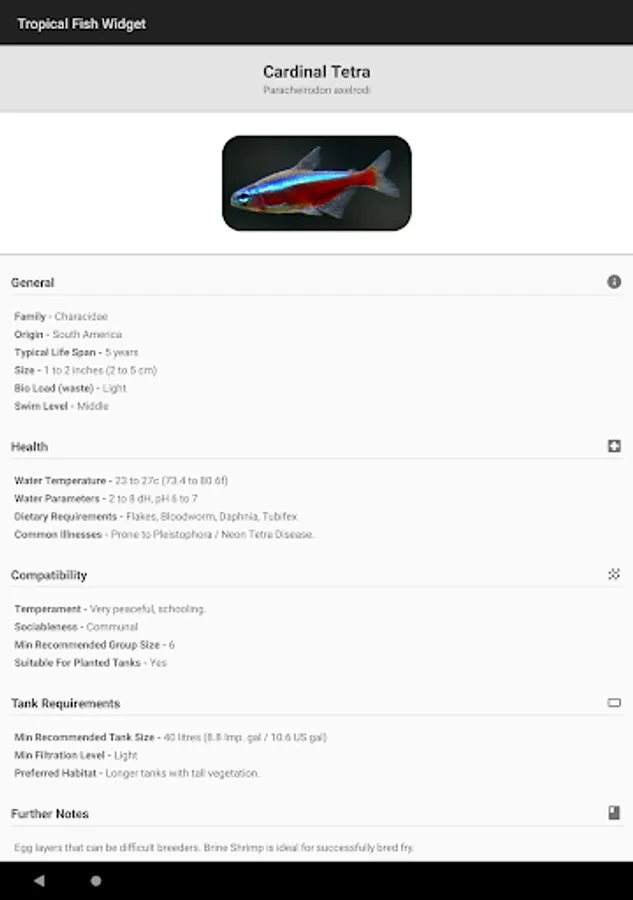 ✪ Contains hundreds of unique profiles, including dedicated images and a highly detailed care sheet for each one... just tap on the fish image to access the info.
