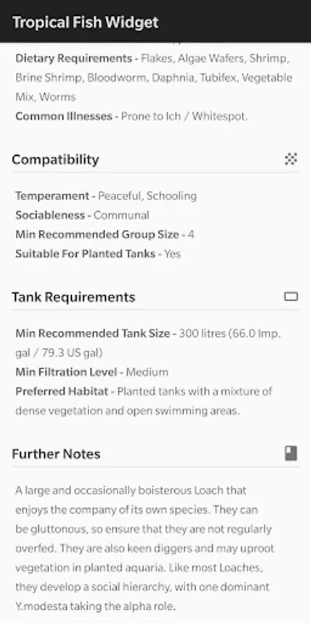 ✪ Works as standalone widgets or in integration mode (integration mode requires Tropical Fish Guide Pocket Edition v2.79 or higher to be installed. This provides access to TFGPE's favouriting and personal note features directly on the widget's profiles).