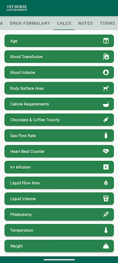✔ Calculation and conversion tools, such as gas/liquid flow rates, blood transfusion, K+ infusion, phlebotomy, body surface area, blood volume, calorie requirements, chocolate/coffee toxicity, heart beat counter / bpm, weights and temperatures.