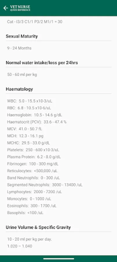 A quick reference guide for veterinary nurse professionals. Contains a comprehensive reference of normal parameters and ranges for small and common household pets. A perfect pocket companion for vets and vet nurses / vet technicians on the go.