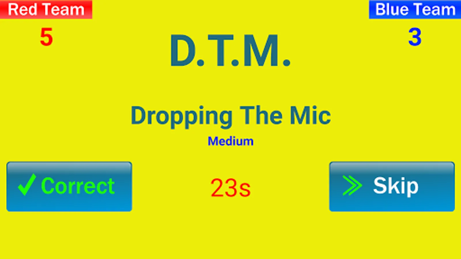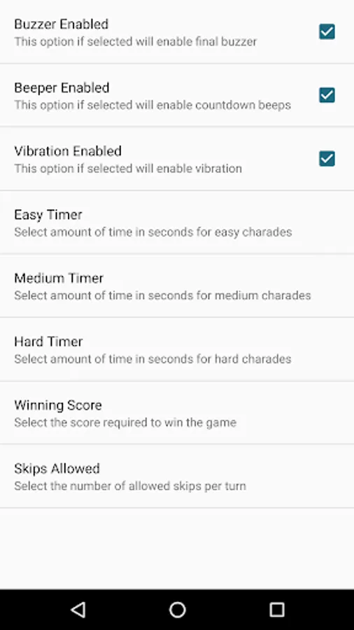 - Each charade has a difficulty rating of Easy, Medium, or Hard, which are randomly chosen each turn. The time allowed to act out the charade varies by difficulty. At the start of the game the time allowed for each level of difficulty can be adjusted under SETTINGS.