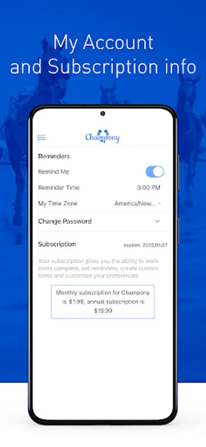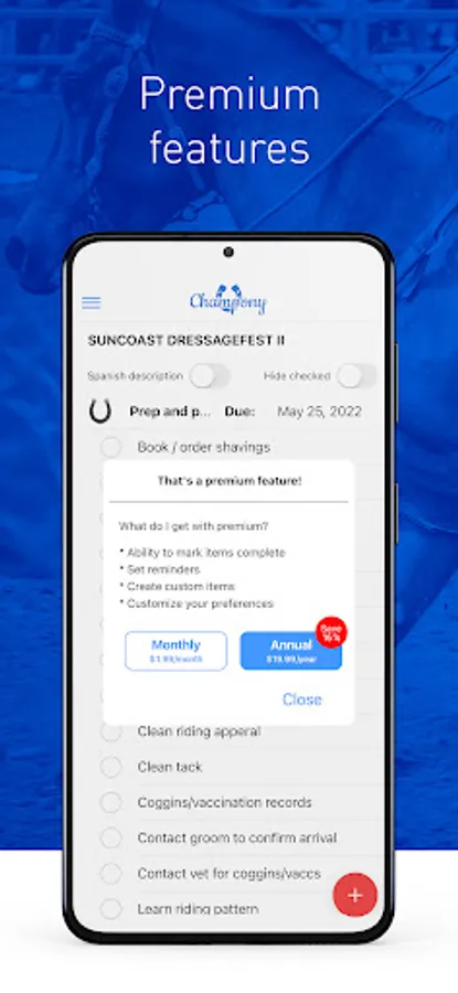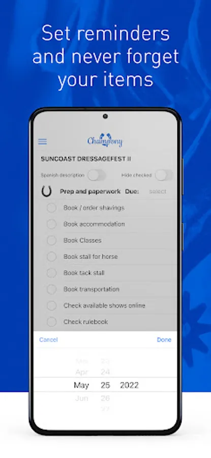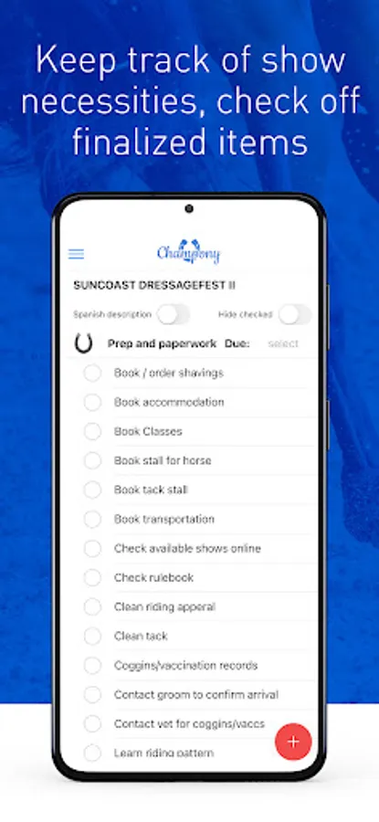 Champony is targeted for people who travel to horse shows to compete. The app provides a checklist and reminder functionality, so you are organized and worry-free at your shows!