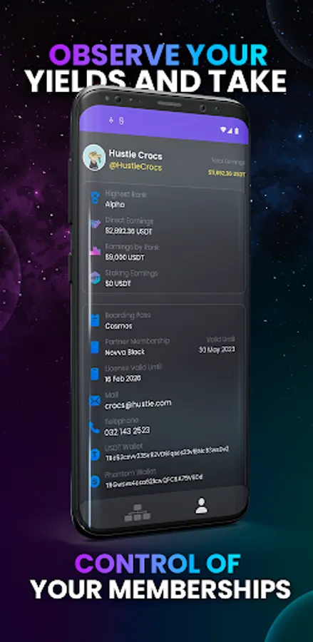 Here you will be able to see your current rank, profile data like your USDT, Metamask and Phantom wallets. And your total earnings from Novva Space.