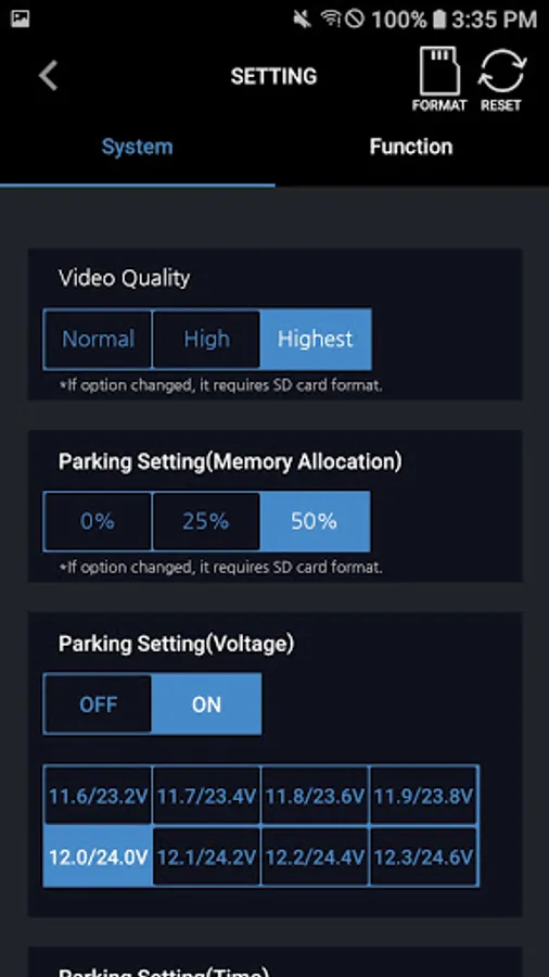 - Dashcam Setting : Can set system and function options as video quality, time, and etc.