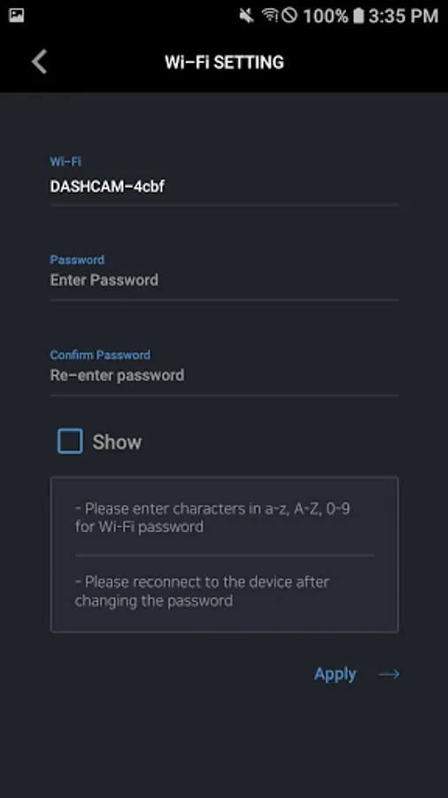 ※ Be aware that recording will be deactivated while mobile APP is connected with dashcam Wi-Fi.