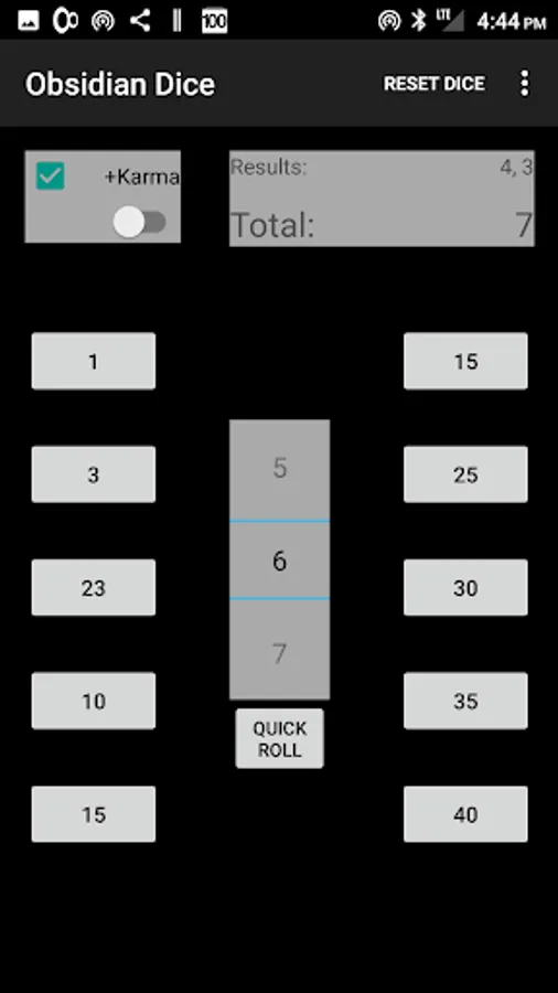Rolls dice for steps 1-66, with either D6 or D8 karma dice. Lists total result, each individual die roll, and maintains a history of previous rolls. There are also 10 quick roll slots, letting you preset commonly used Steps.