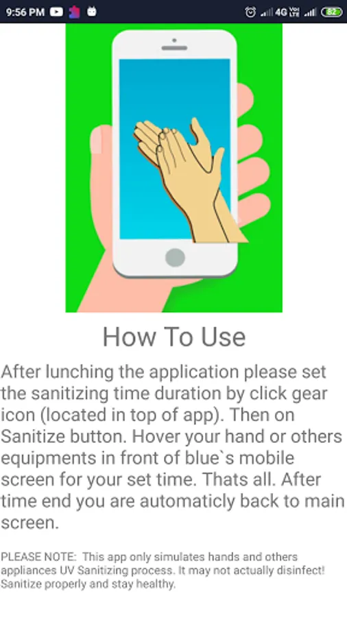Please Note: This app only simulates hands and others appliances UV Sanitizing process. It may not actually disinfect! Sanitize properly and stay healthy.