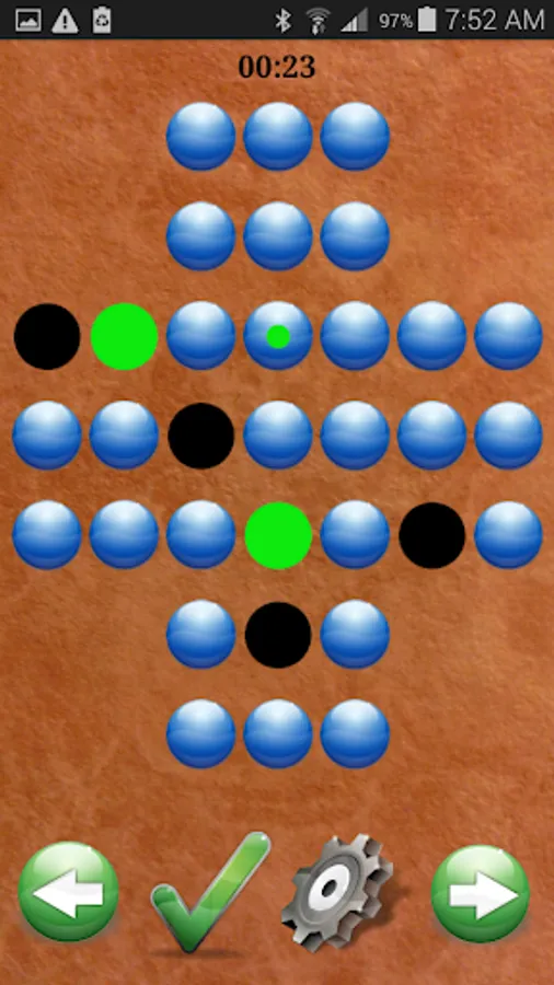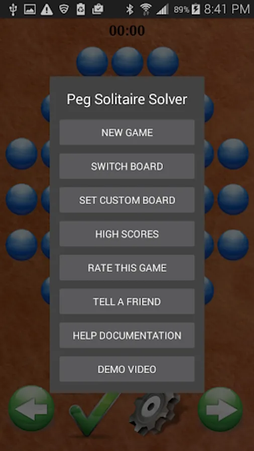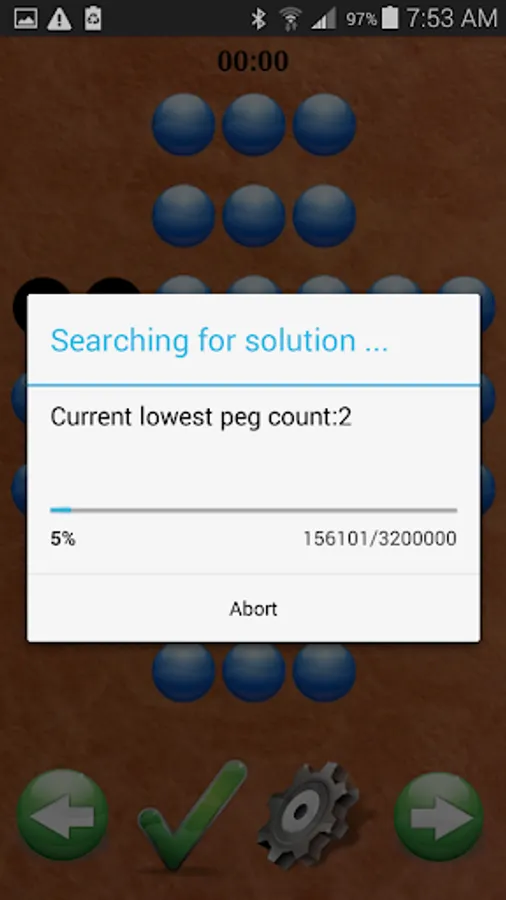 Depending on the board arrangement the solver can take anywhere from a few seconds to several minutes to find a solution. Since this can lower you battery power it is recommended that the phone be plugged in to a charging station while the solver is running. The FREE version of this game will find a solution that leads to a minimum of 3 PEGS ONLY. The paid version can find a solution with 1 peg.
