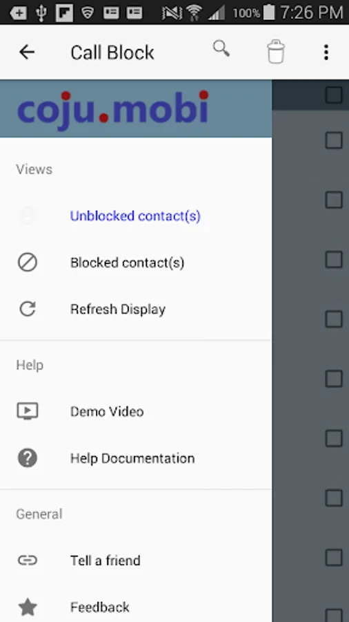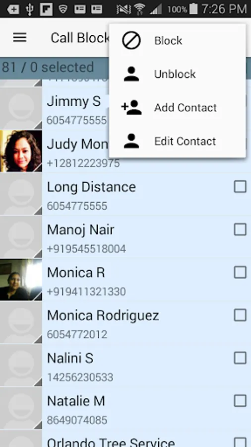 The Call Block app has two views one for unblocked and another for blocked contacts. The unblocked contacts view displays all your stored contacts whose calls are not blocked, while the blocked view displays stored contacts calls from whom are blocked. To block one or contacts, you simply go to the unblocked view and selected the contacts you want to block. Then using the block option you can block calls from all those contacts with a single tap.