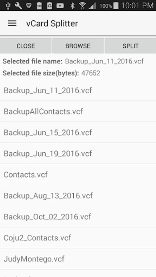 At startup, the app automatically lists all the VCF file(s) in your device and just by clicking on it you can split it into multiple vCard file. If your file is not listed, there is also a Browse option to allow you select the file from other places, like Google Drive.
