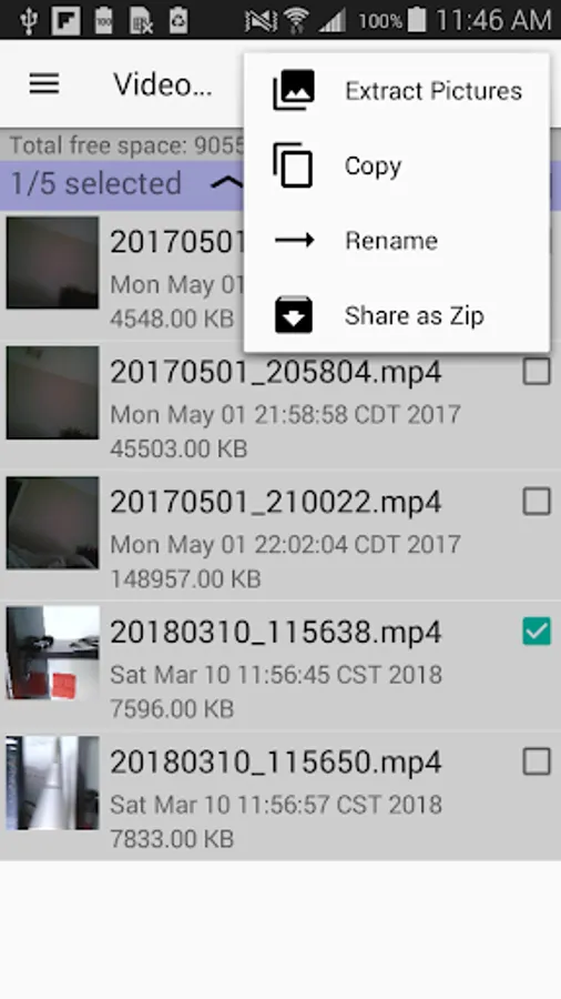 Apart from picture extraction, the app also allows you to rename and delete video files. Selected videos can also be shared with friends by sending them by email, or putting it in Google cloud. You also have the option of putting multiple video files in a single ZIP file and sending them via email.