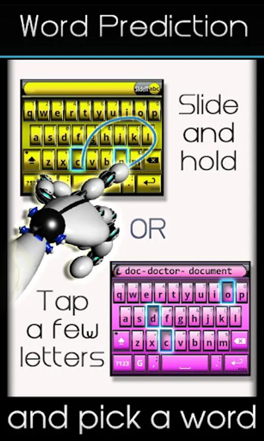 Instead of entering text by tapping on the keyboard letters, SlideIT keyboard eases texting by sliding a finger along the keyboard letters, while the words “magically” appear on the screen.