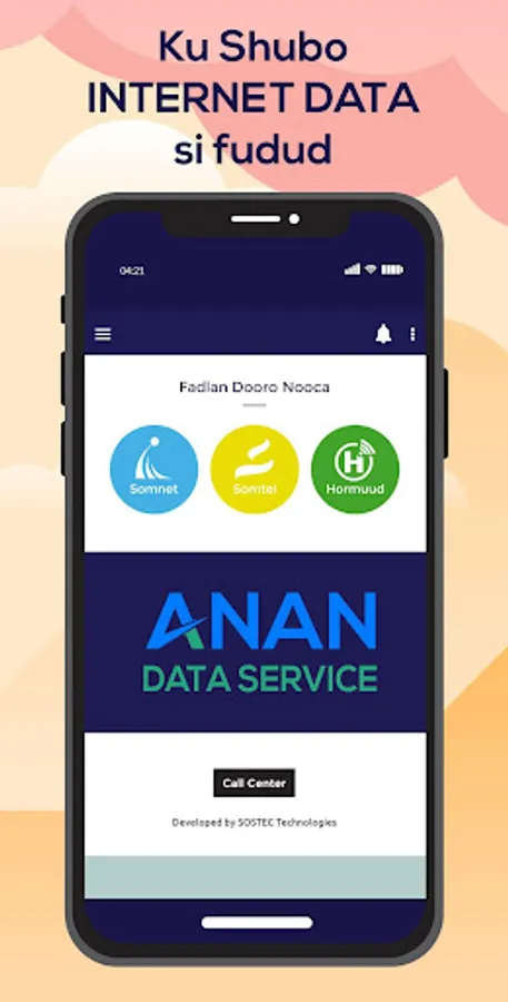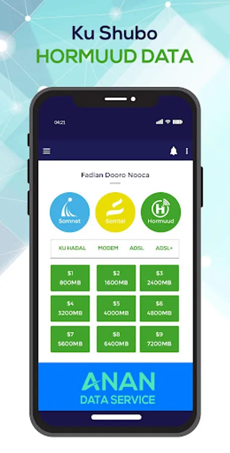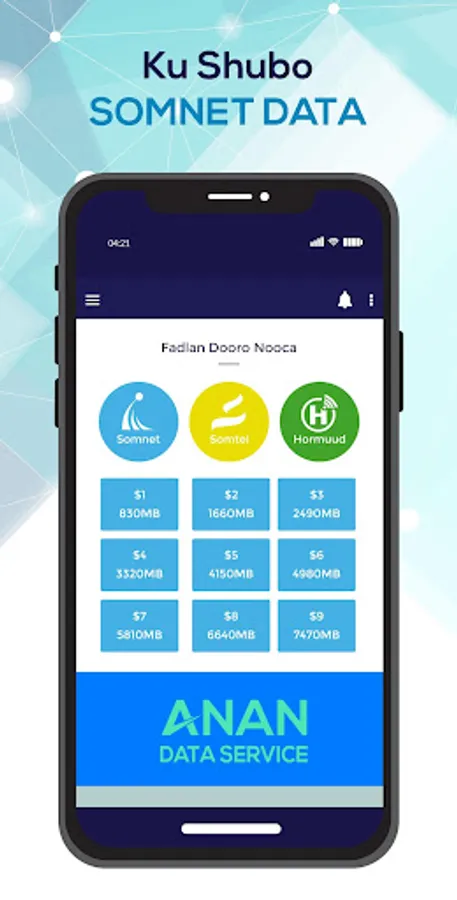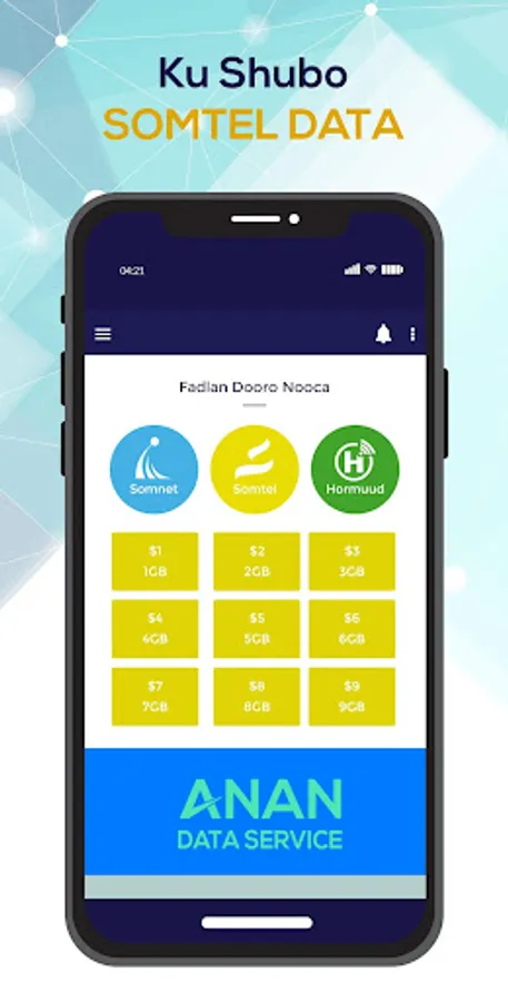 Anan Data waa App kuu fududeynaa inaad si fudud ugu shubato xirmooyinka internet ka ee Somnet,Somtel iyo Hormuud bixiyaan , adoon wicin qof oo ii soo tuurna oran ayaad si sahlan ku heleysaa xirmo internet ah.